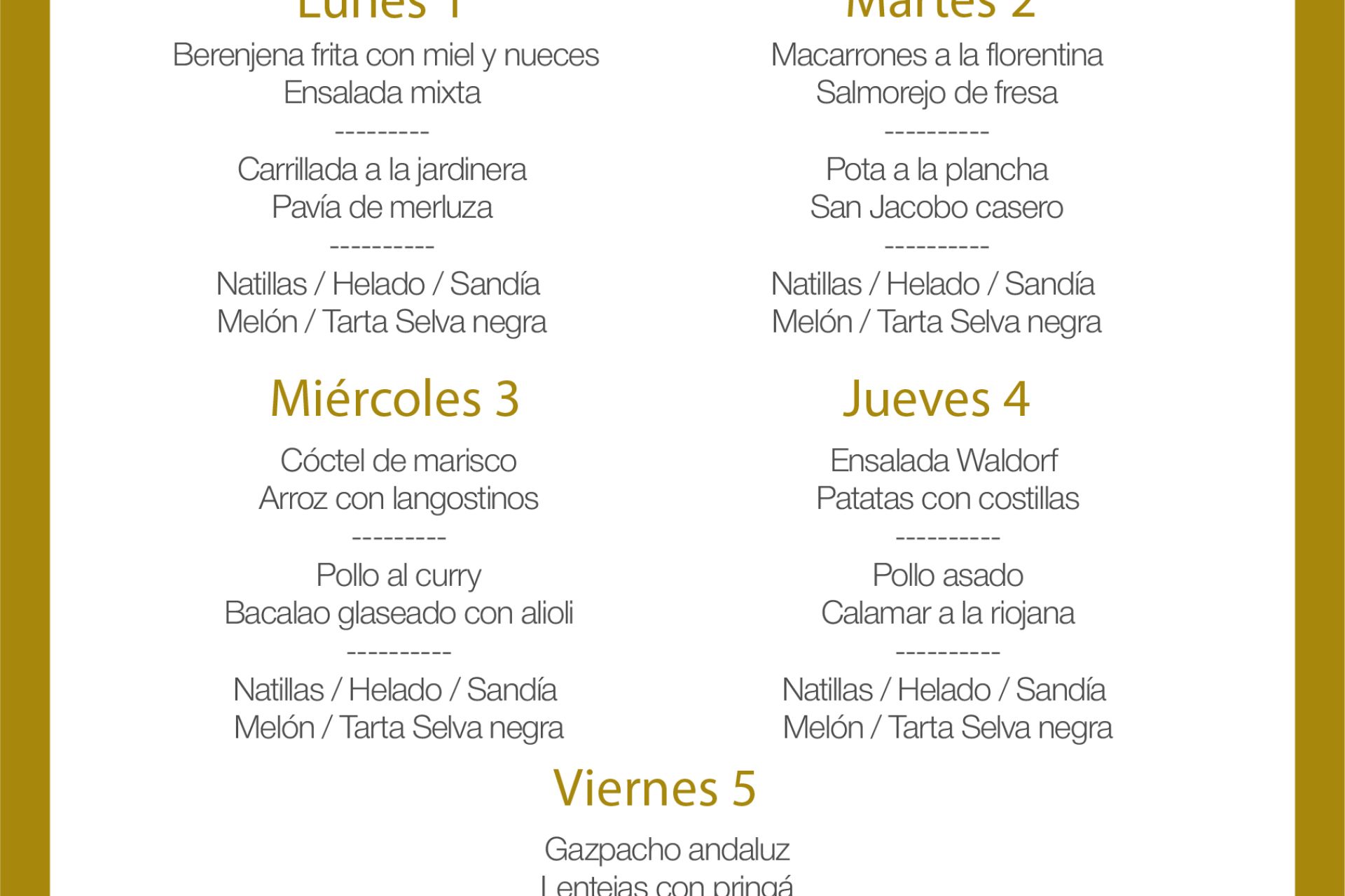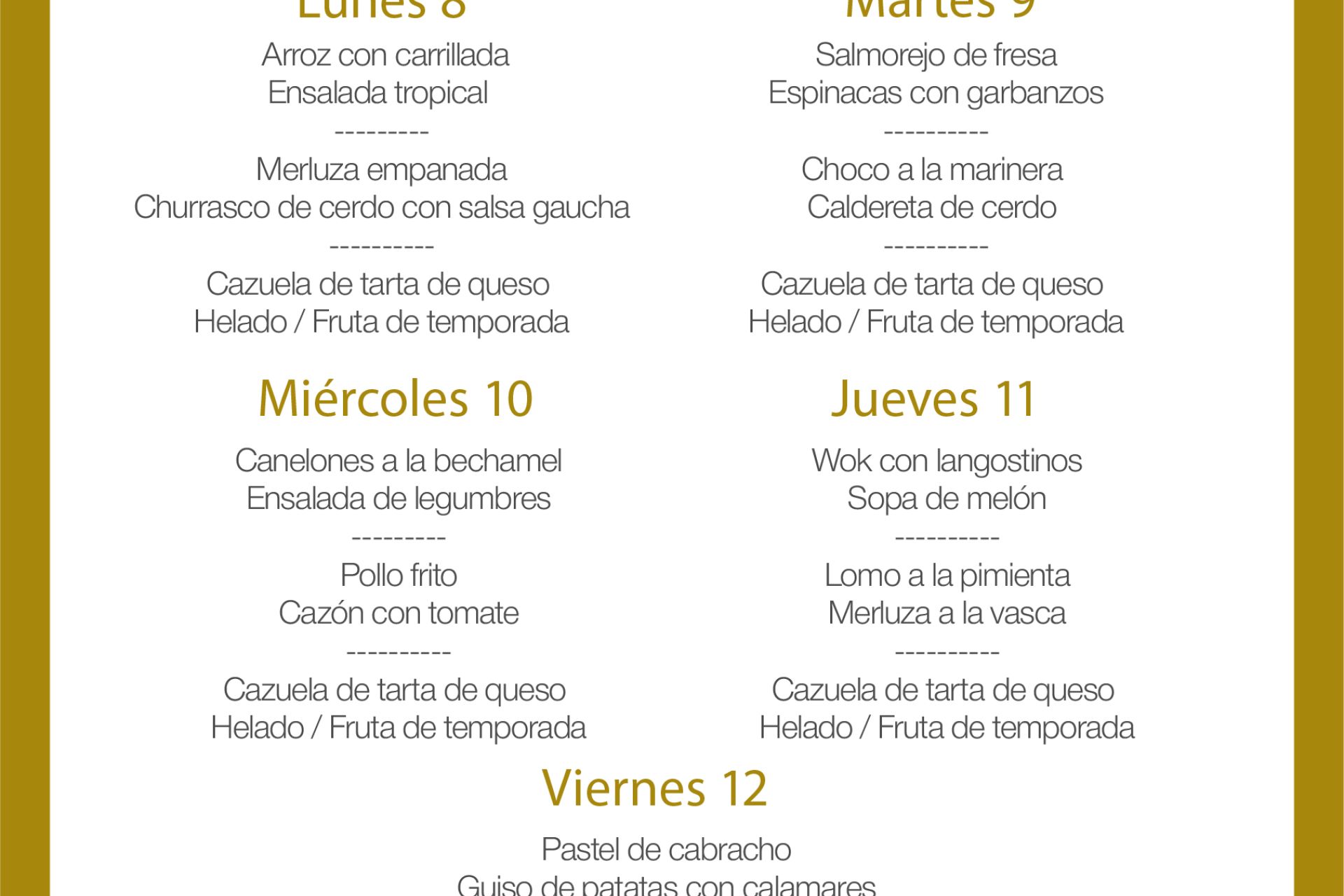 Menú intersemanal del servicio de restauración del Club Náutico