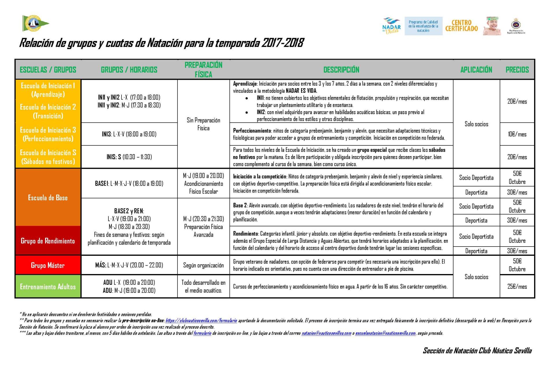 Relación de grupos y cuotas para la temporada 2017/2018, tanto de cursos de iniciación para menores como de cursillos para adultos, Escuela de base, grupo de rendimiento y equipo Máster.