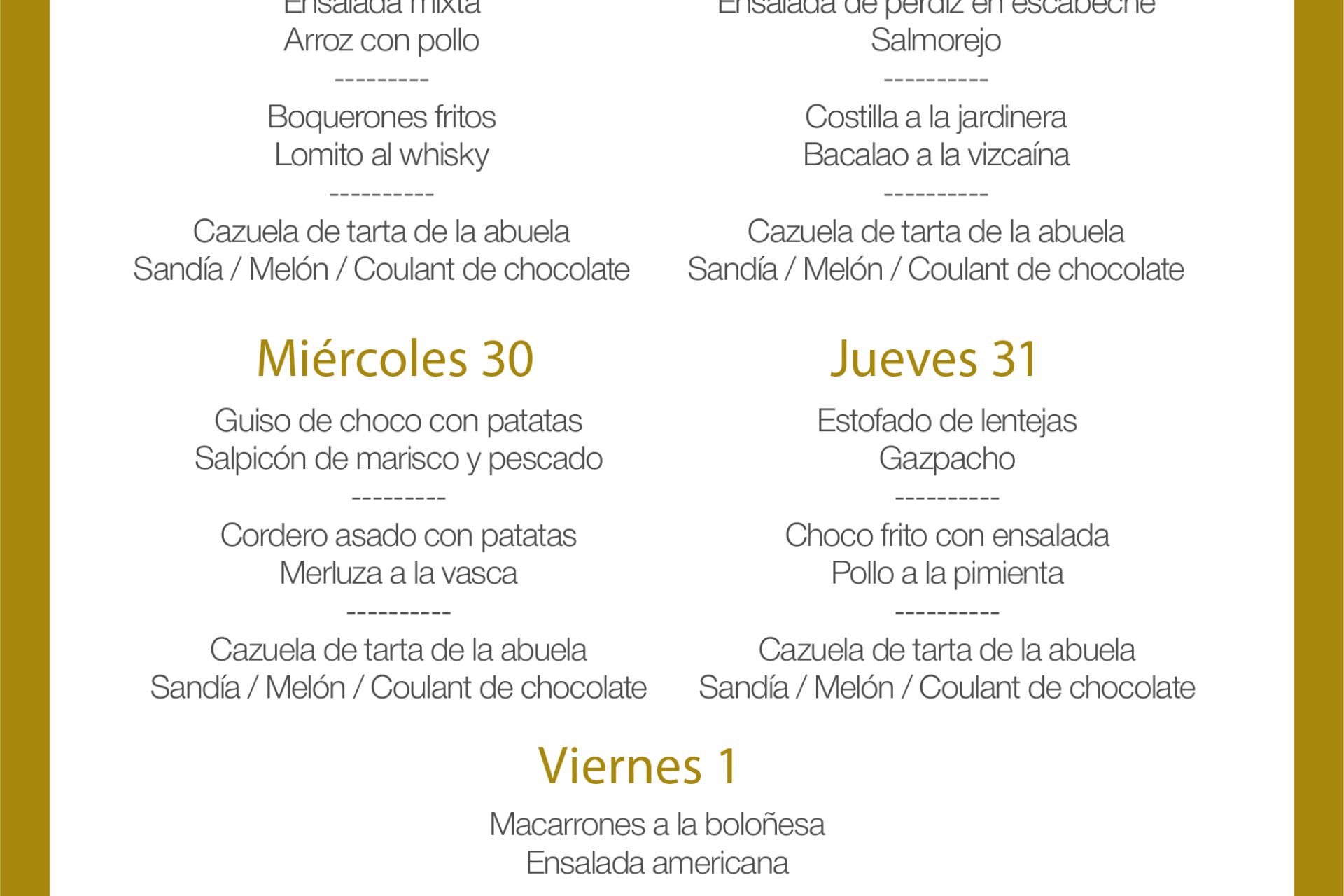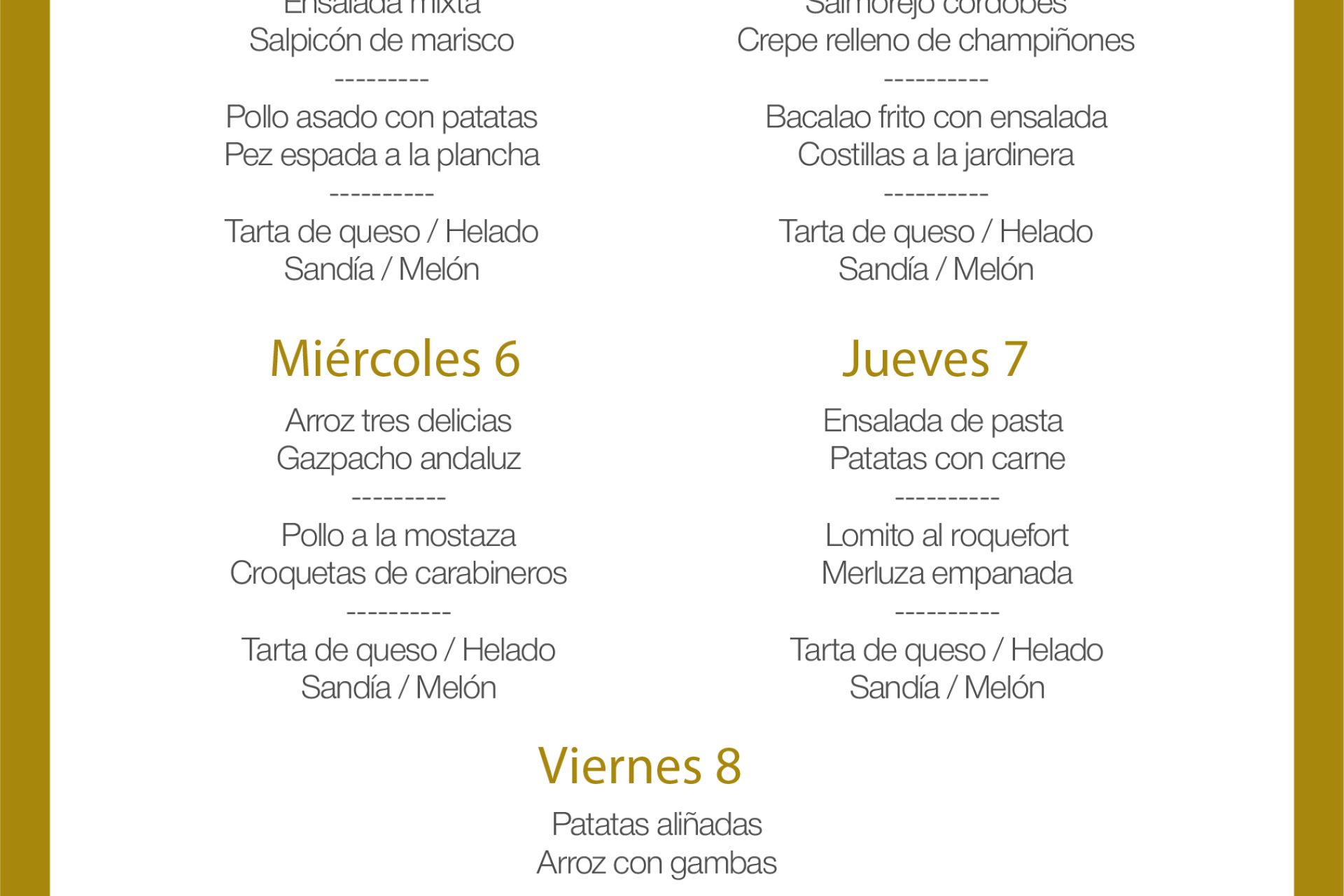 Menú intersemanal del servicio de restauración del Club Náutico