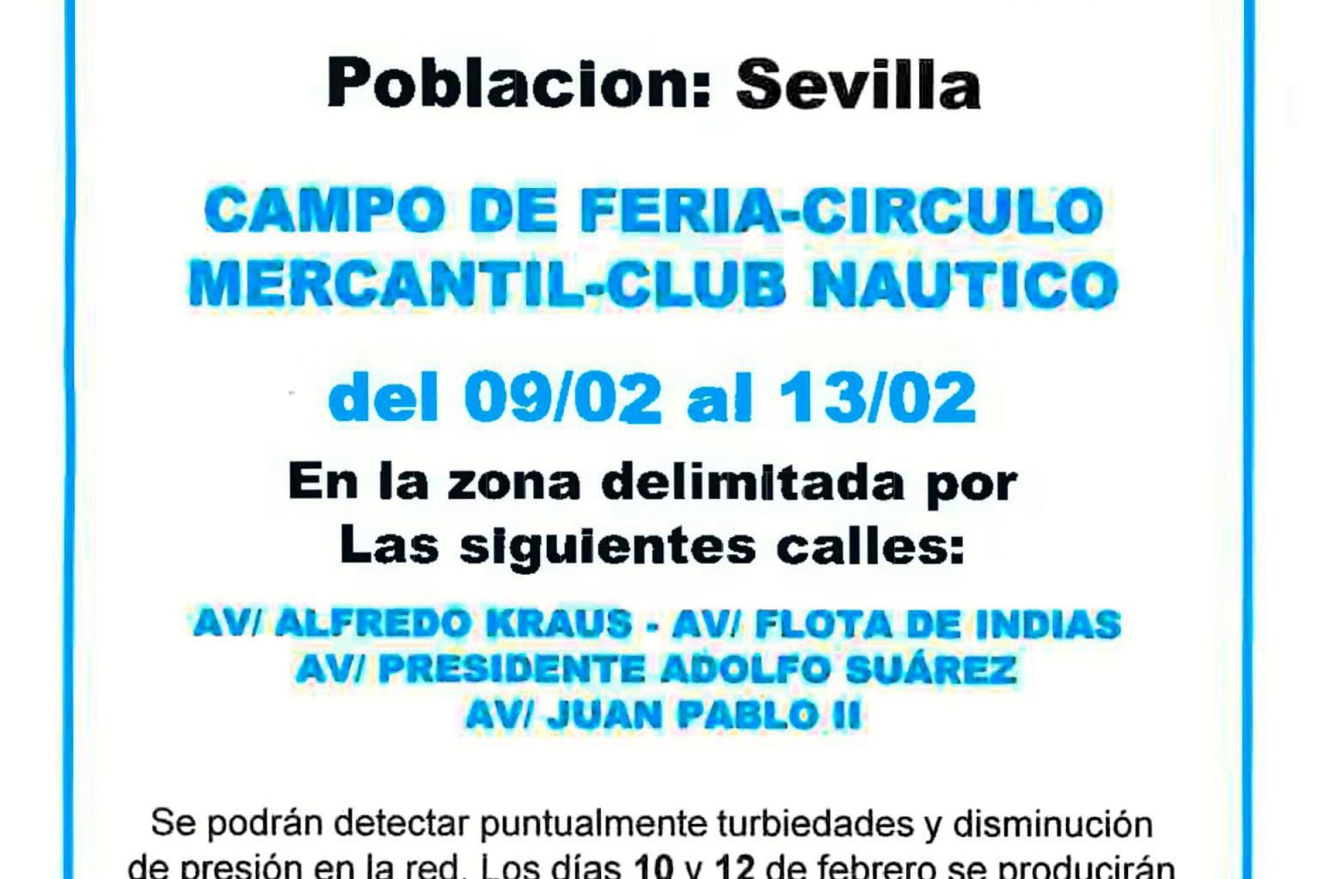 Debido a labores de mantenimiento de EMASESA, del lunes 9 al viernes 13 de febrero se podrán detectar ocasionalmente turbiedades y disminución de la presión de la red de abastecimiento.