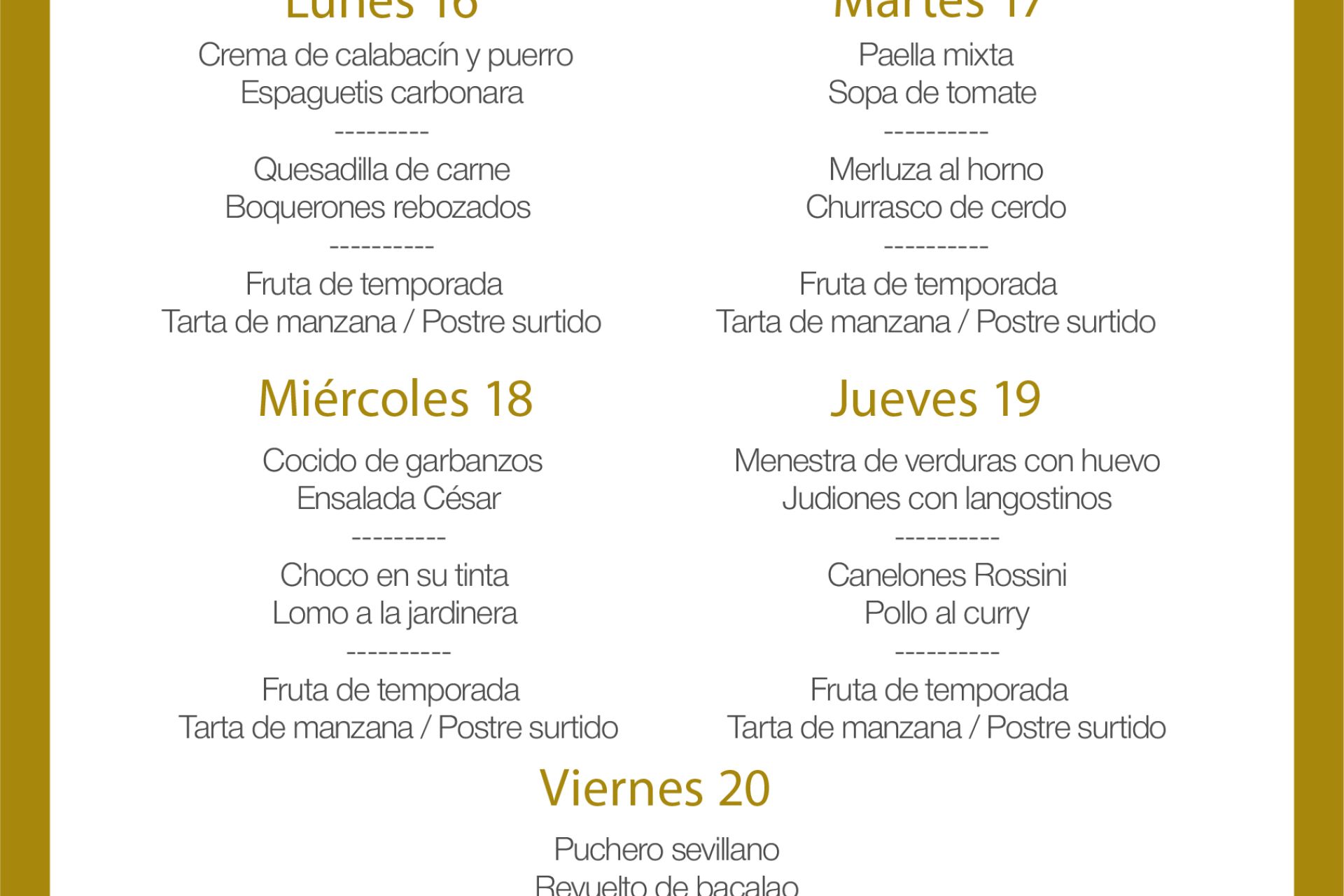 Menú intersemanal del servicio de restauración del Club Náutico