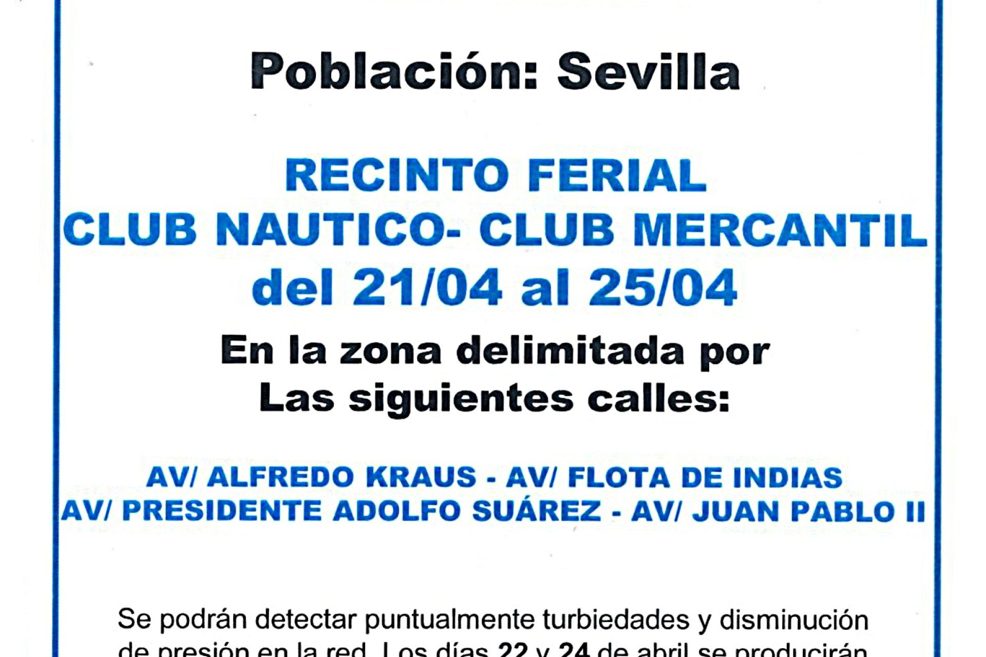 Debido a labores de mantenimiento de EMASESA, del 21 al 25 de abril se podrán detectar ocasionalmente turbiedades y disminución de la presión de la red de abastecimiento.