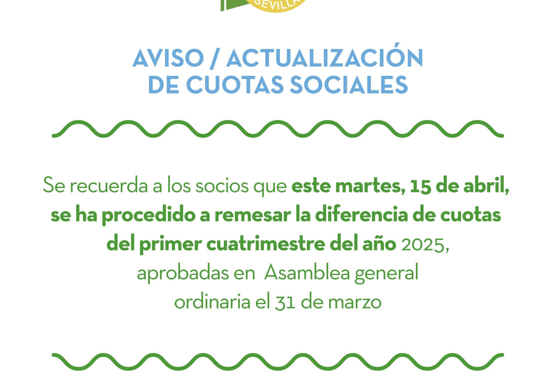 Se informa a los socios que este martes, 15 de abril, se ha procedido a remesar la diferencia de cuotas del primer cuatrimestre del año 2025, aprobadas en la Asamblea general ordinaria del 31 de marzo.
