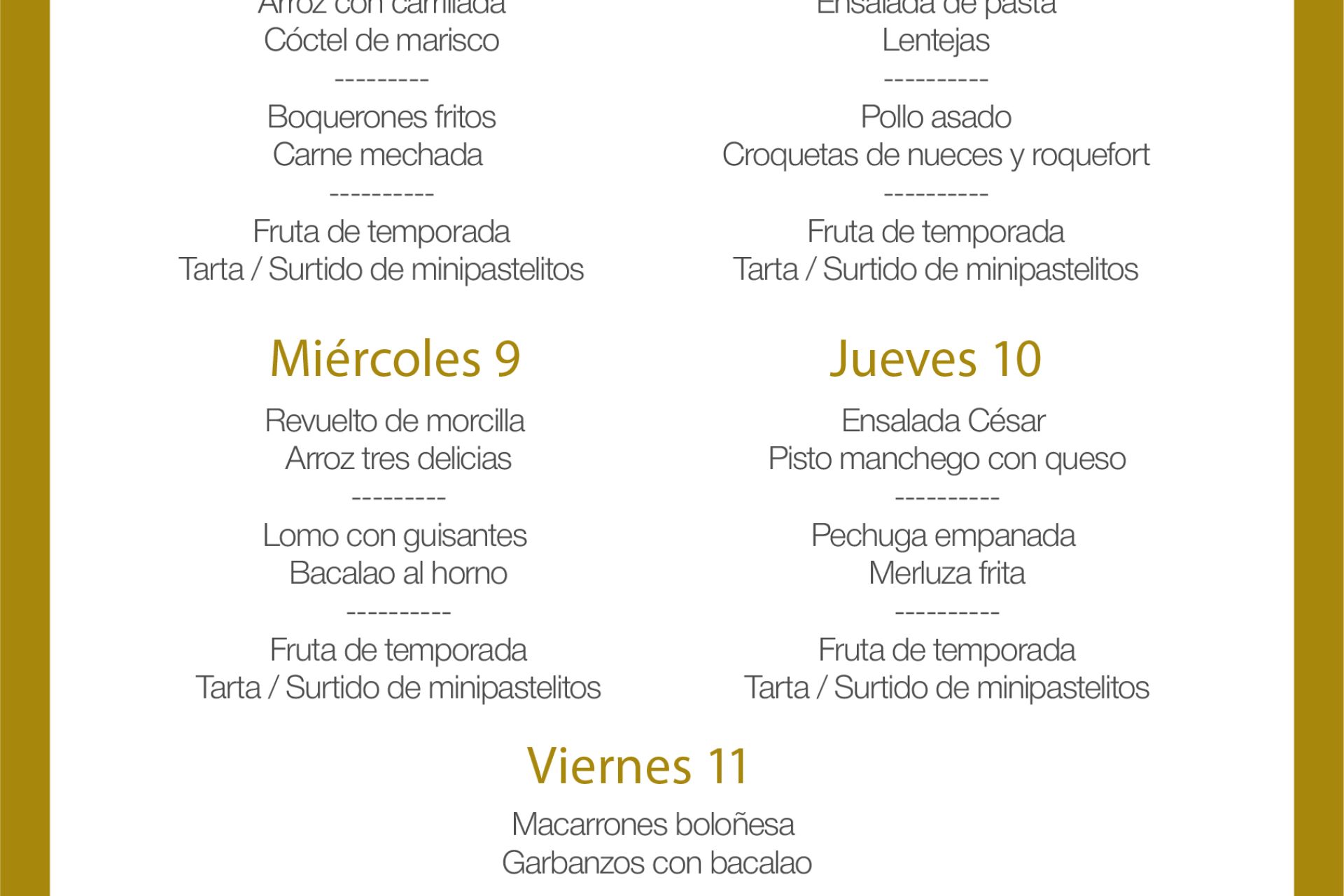 Menú intersemanal del servicio de restauración del Club Náutico