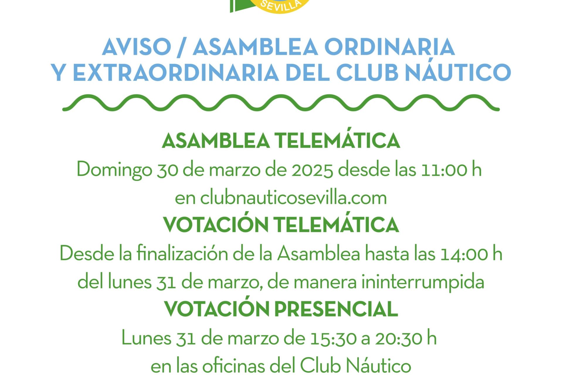 Los socios de Honor, Fundadores y Numerarios del Club Náutico Sevilla están citados de forma presencial y telemática el domingo 30 de marzo de 2025 a las 11:00 horas en primera convocatoria o a las 11:15 horas en segunda convocatoria.