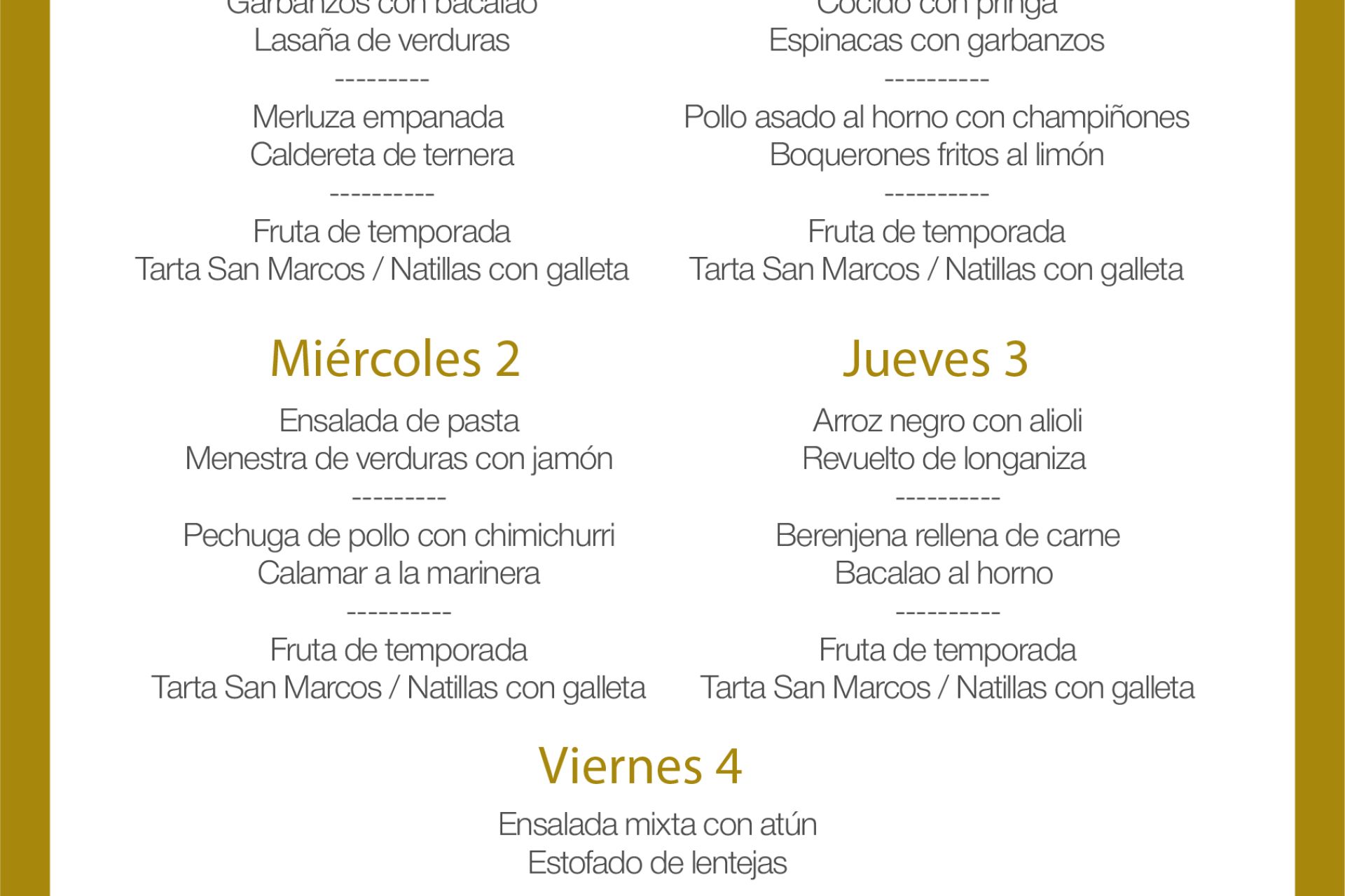 Menú intersemanal del servicio de restauración del Club Náutico