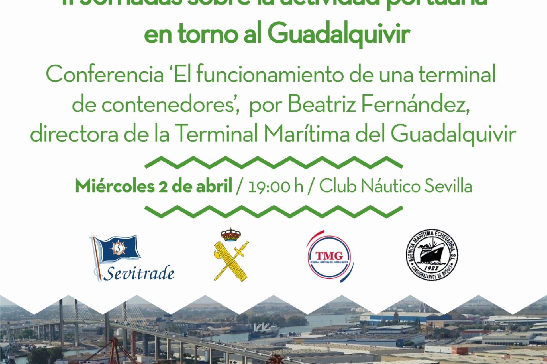 El miércoles 2 de abril a las 19:00 h en el Club Náutico a cargo de Beatriz Fernández, directora de la Terminal Marítima del Guadalquivir, empresa estibadora de contenedores del Puerto de Sevilla, tercera ponencia de las II Jornadas sobre la actividad portuaria en torno al Guadalquivir ‘Sevilla es su puerto’, organizadas en colaboración con la Real Liga Naval Española.