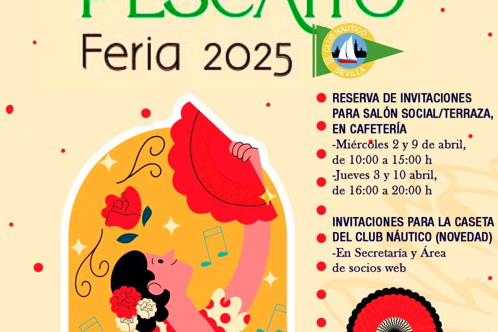Disponibles al precio de 45€/persona en la cafetería del salón social los miércoles 2 y 9 de abril (de 10:00 a 15:00 h) y los jueves 3 y 10 (de 16:00 a 20:00 h), tanto para el salón social y la terraza, sin límite de personas, como para la cena en la caseta de Feria del Club Náutico, novedad este año y para la que es necesario obligatoriamente reservar de forma previa pase de caseta en el ÁREA DE SOCIOS WEB o de forma directa en Secretaría.