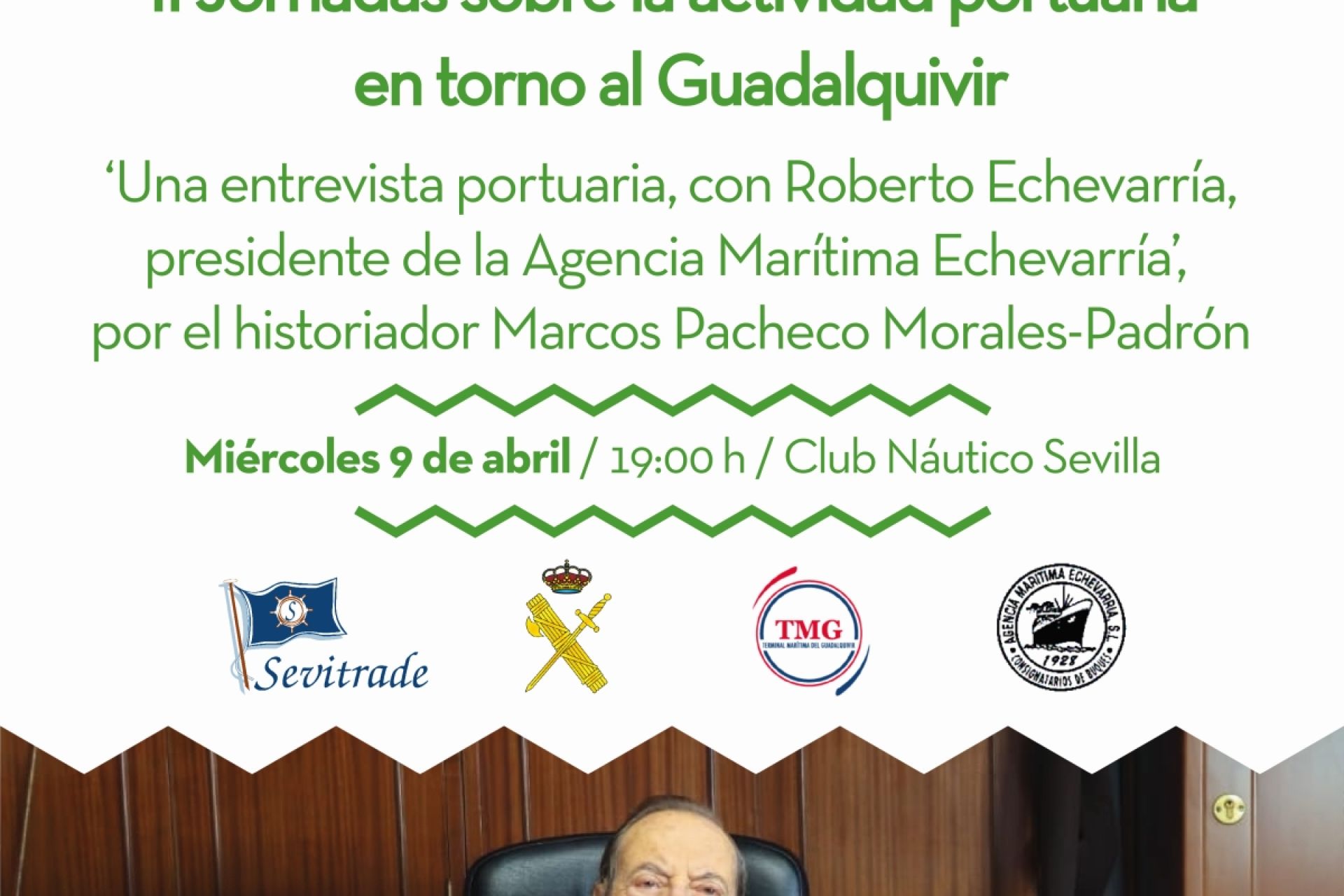 El miércoles 9 de abril a las 19:00 h en el Club Náutico, el presidente de la Agencia Marítima Echevarría, empresa estibadora del Puerto de Sevilla, será entrevistado por Marcos Pacheco Morales-Padrón en la cuarta y última convocatoria de las II Jornadas sobre la actividad portuaria en torno al Guadalquivir ‘Sevilla es su puerto’, organizadas en colaboración con la Real Liga Naval Española. Entrada libre hasta completar aforo.