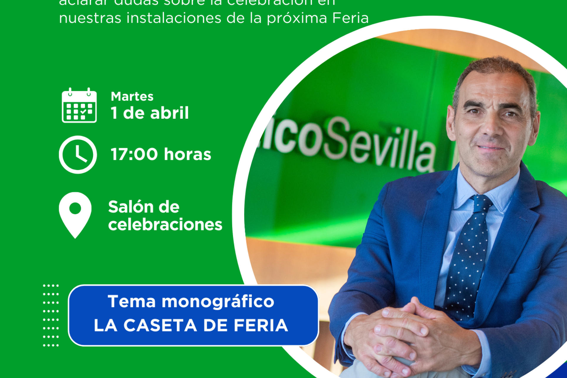 Este martes, 1 de abril, a las 17:00 horas, te invitamos a compartir un café con Cayetano García de la Borbolla Vallejo y su directiva para aclarar dudas sobre la celebración en nuestras instalaciones de la próxima Feria, para la que a partir del 2 de abril podrán solicitarse en Secretaría los pases de acceso para acceder a 'la caseta' del Club Náutico.