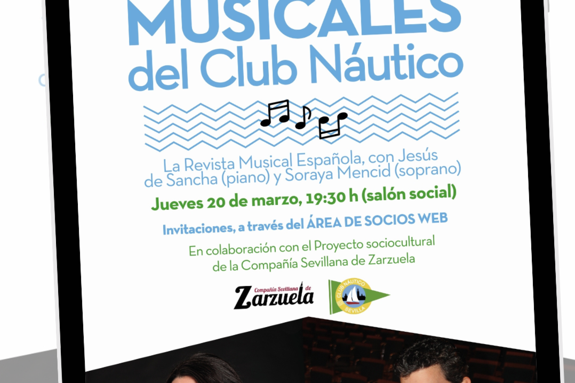 Este jueves, 20 de marzo, a las 19:30 horas en el salón social, la Revista Musical Española con Jesús de Sancha (piano) y Soraya Méncid (soprano), organizado con la colaboración del Proyecto sociocultural de la Compañía Sevillana de Zarzuela. Entrada libre hasta completar aforo.