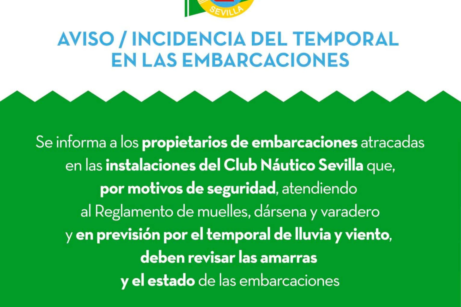 Se informa a los propietarios de las embarcaciones atracadas en las instalaciones del Club Náutico Sevilla que, por motivos de seguridad, atendiendo al Reglamento de muelles, dársena y varadero y en previsión por el temporal de lluvia y viento, deben revisar las amarras y el estado de las embarcaciones.