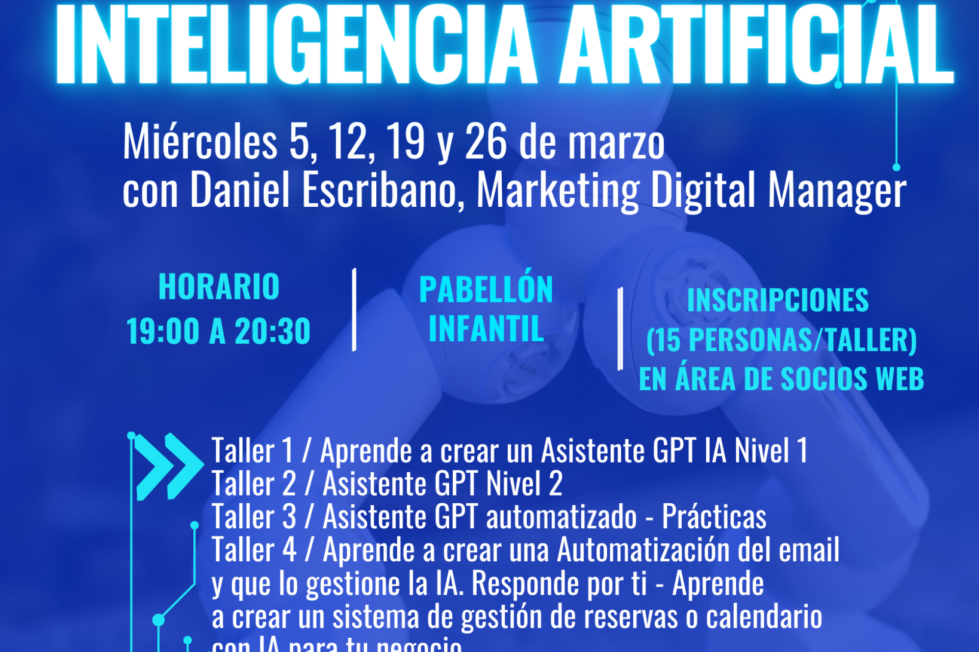 Los miércoles 5, 12, 19 y 26 de marzo de 19:00 a 20:30 en el Pabellón infantil del Club Náutico con Daniel Escribano, Marketing Digital Manager. Inscrpciones (15 personas/taller), a partir del 3 de marzo a través del ÁREA DE SOCIOS WEB