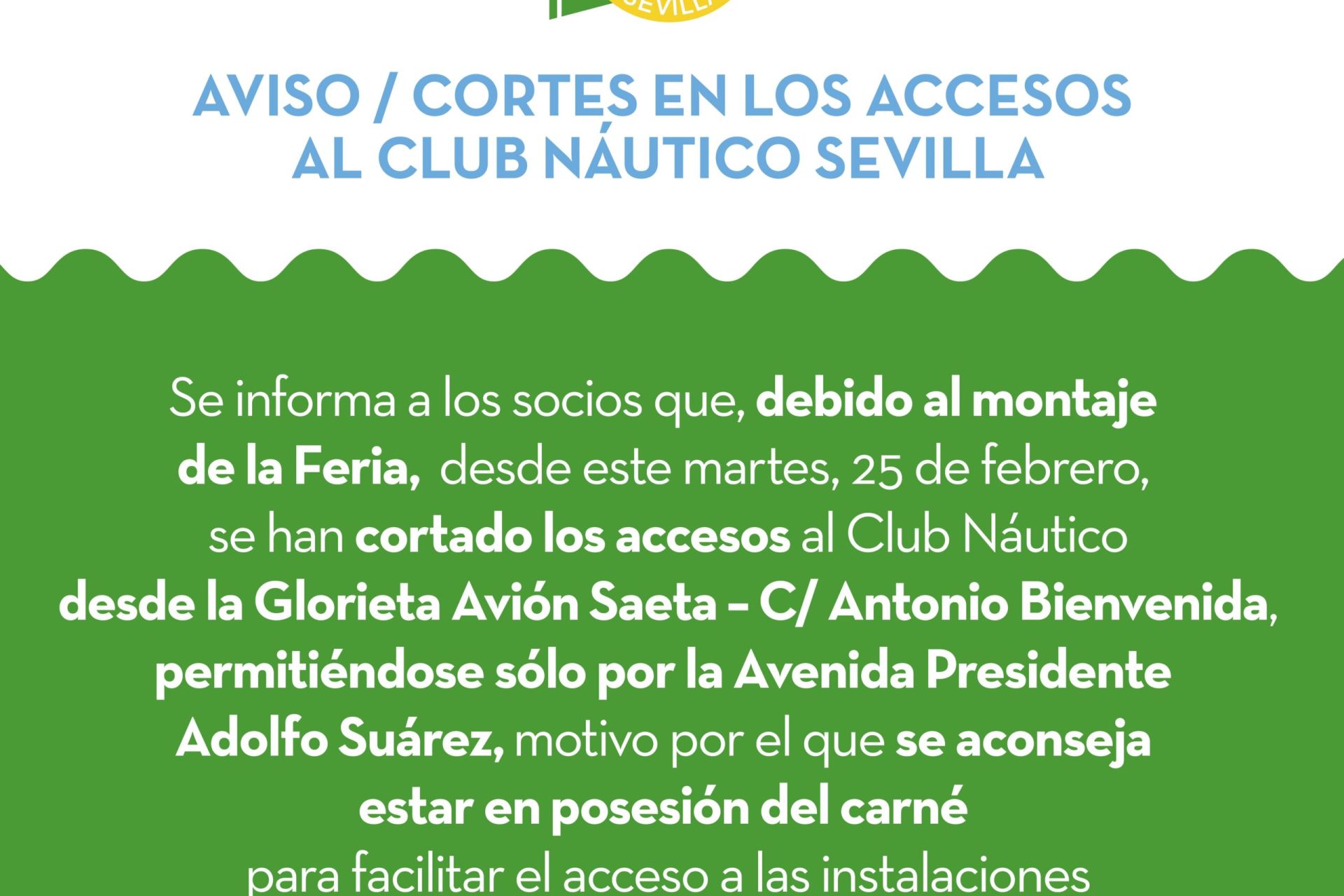Se informa a los socios que, debido al montaje de la Feria, desde este martes, 25 de febrero, se han cortado los accesos al Club Náutico desde la Glorieta Avión Saeta – C/ Antonio Bienvenida, permitiéndose sólo por la Avenida Presidente Adolfo Suárez, motivo por el que se aconseja estar en posesión del carné para facilitar el acceso a las instalaciones.