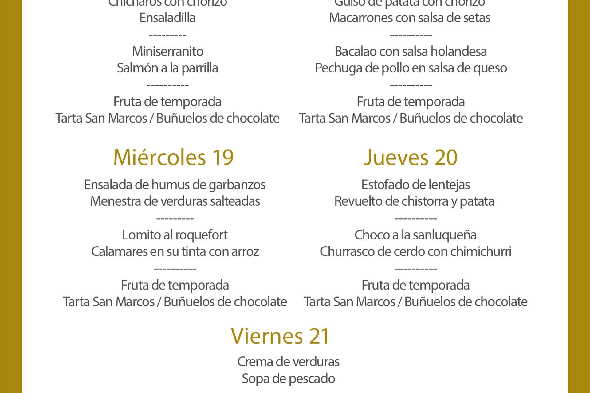 Menú intersemanal del servicio de restauración del Club Náutico