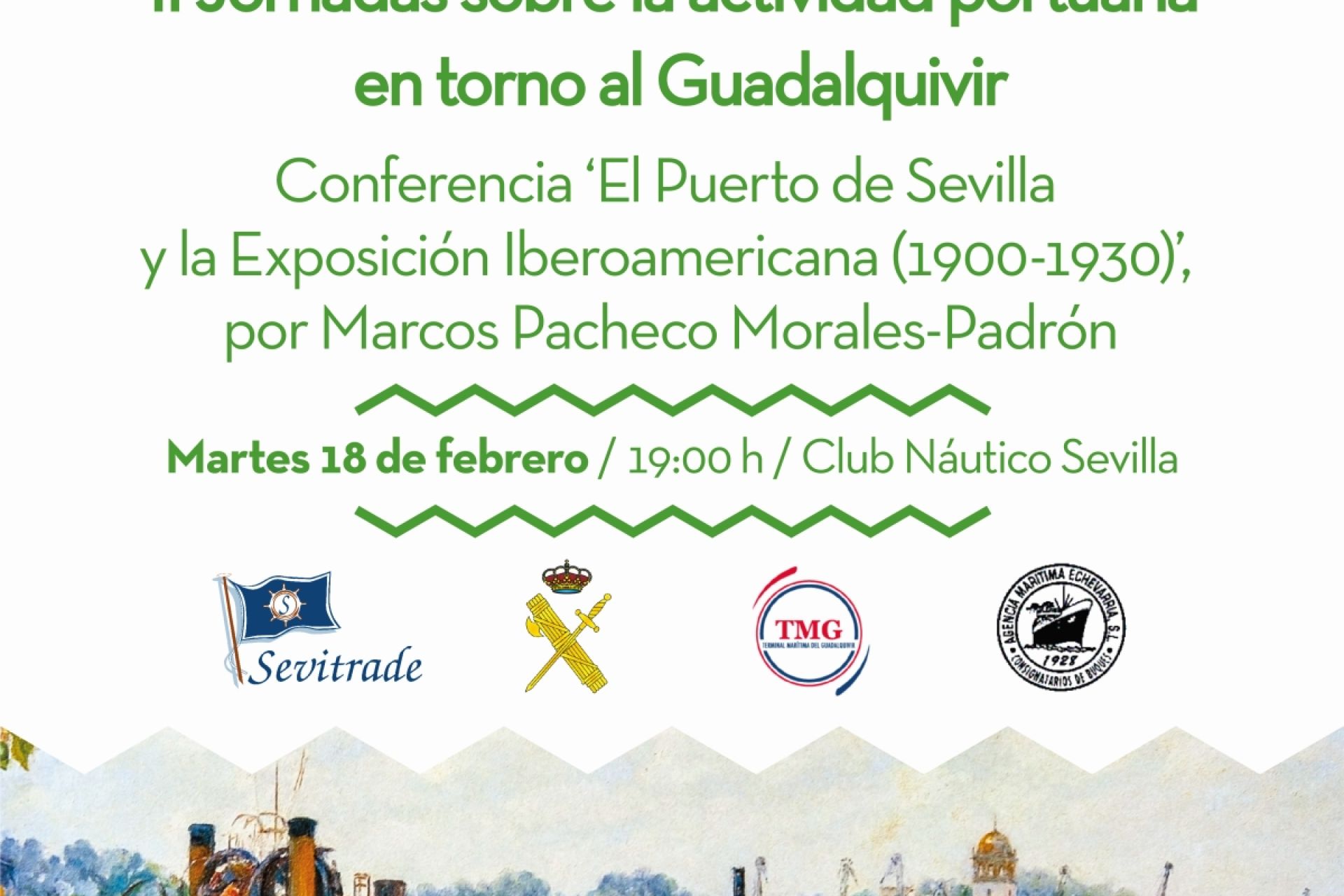 El martes 18 de febrero a las 19:00 h en el Club Náutico a cargo de Marcos Pacheco Morales-Padrón, historiador y responsable de comunicación e imagen corporativa de Sevitrade, empresa estibadora del Puerto de Sevilla, primera ponencia de las II Jornadas sobre la actividad portuaria en torno al Guadalquivir ‘Sevilla es su puerto’, organizadas en colaboración con la Real Liga Naval Española.