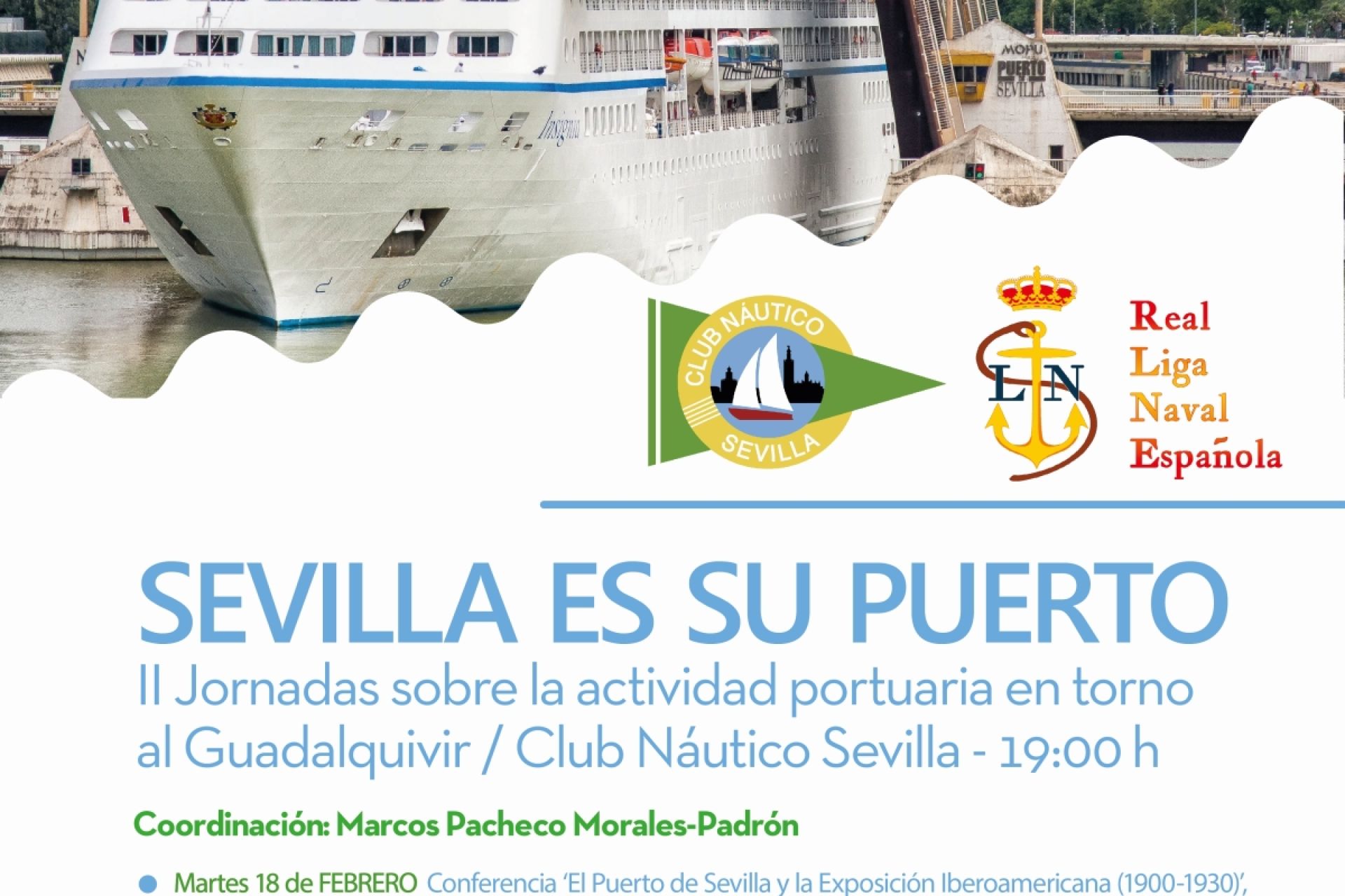 El martes 18 de febrero a las 19:00 h en el Club Náutico a cargo de Marcos Pacheco Morales-Padrón, primera ponencia de las II Jornadas sobre la actividad portuaria en torno al Guadalquivir ‘Sevilla es su puerto’, organizadas en colaboración con la Real Liga Naval Española.