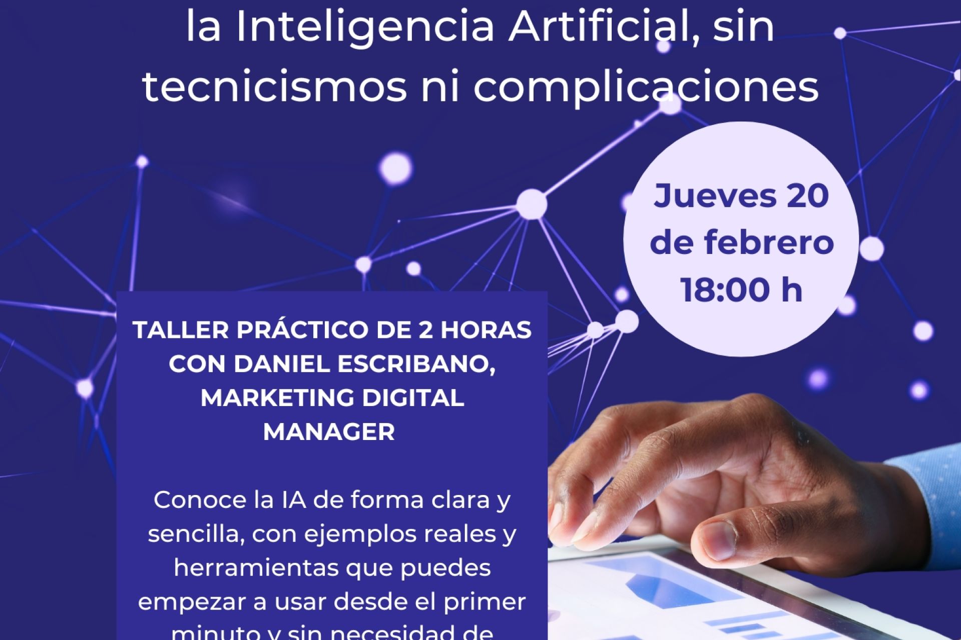 El jueves 20 de febrero a las 18:00 horas en el Club Náutico, charla/taller sobre cómo usar la IA con Daniel Escribano, Marketing Digital Manager. Reserva de plazas, gratuitas, a través del ÁREA DE SOCIOS WEB