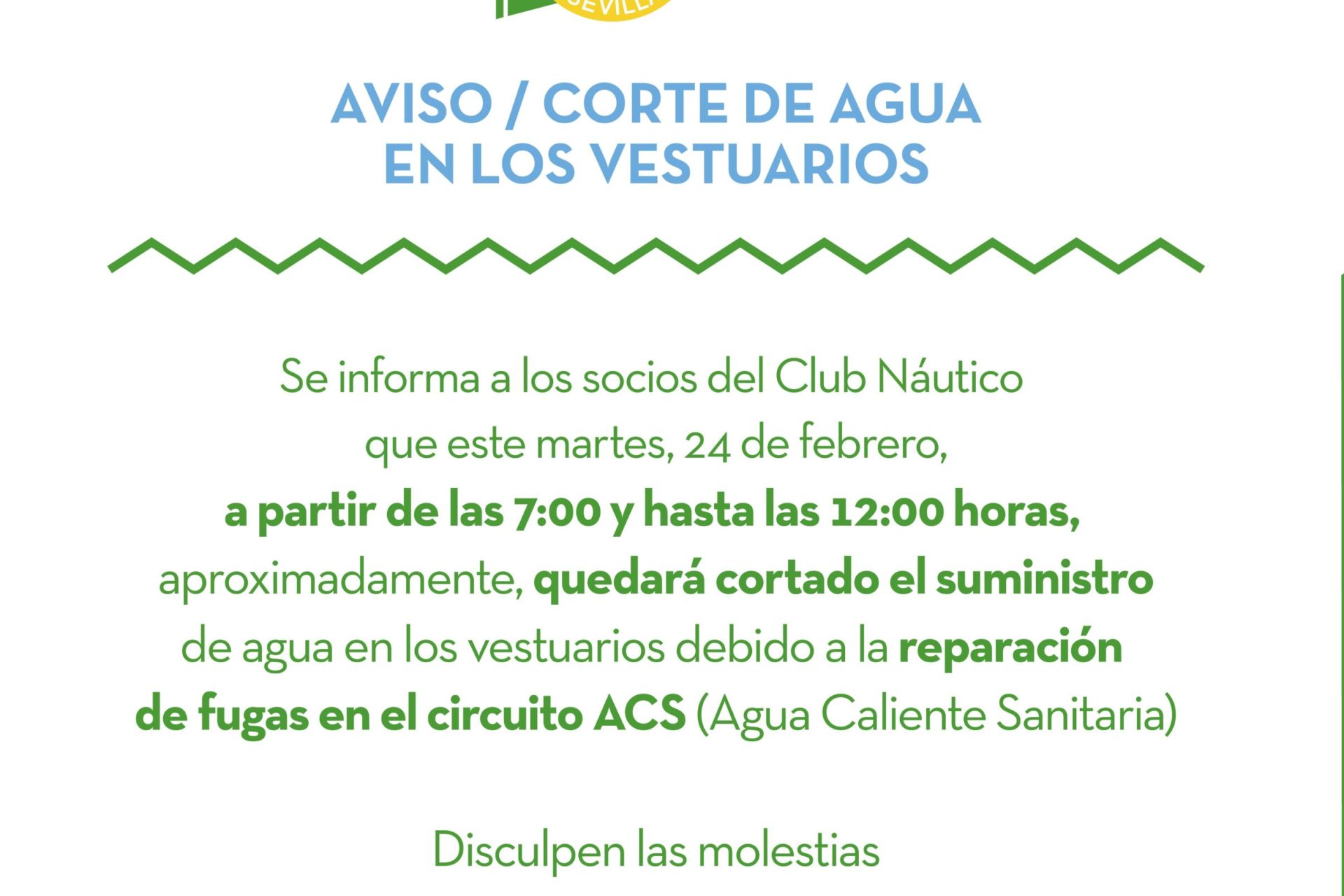 Se informa a los socios del Club Náutico que este martes, 24 de febrero, a partir de las 7:00 y hasta las 12:00 horas, aproximadamente, quedará cortado el suministro de agua en los vestuarios debido a la reparación de fugas en el circuito ACS (Agua Caliente Sanitaria). Disculpen las molestias.