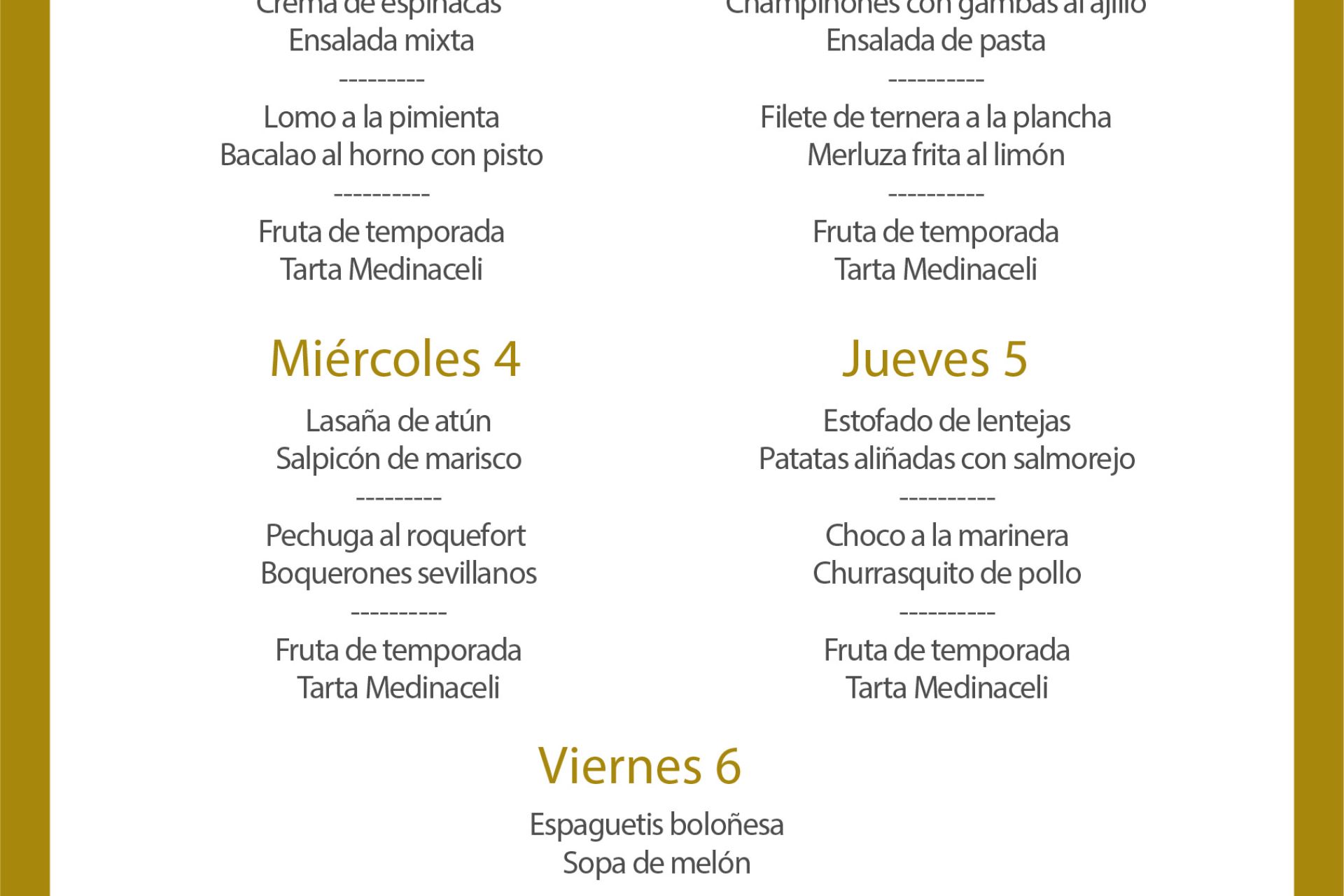 Menú intersemanal del servicio de restauración del Club Náutico