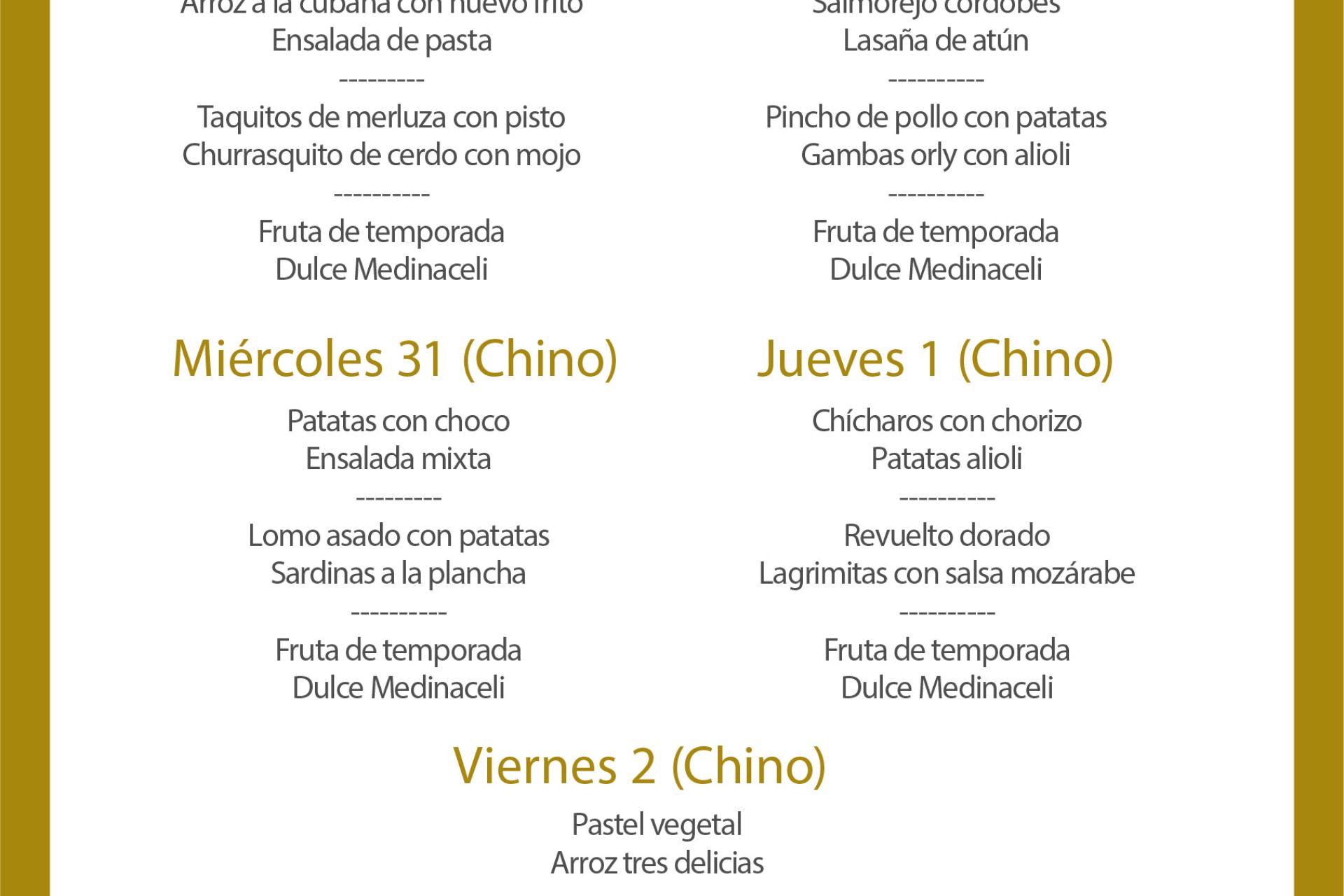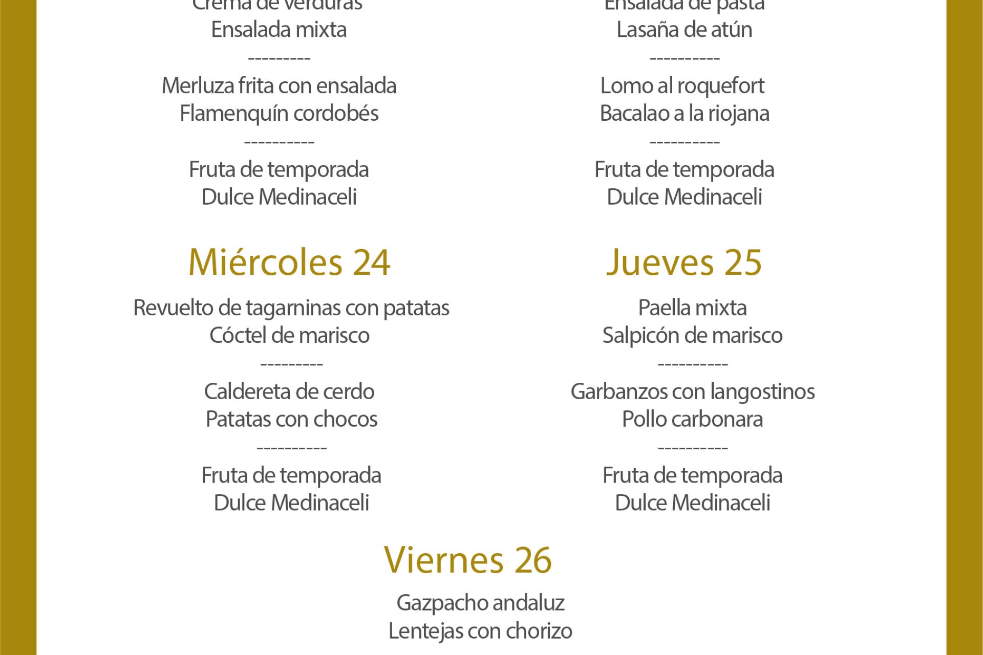 Menú intersemanal del servicio de restauración del Club Náutico