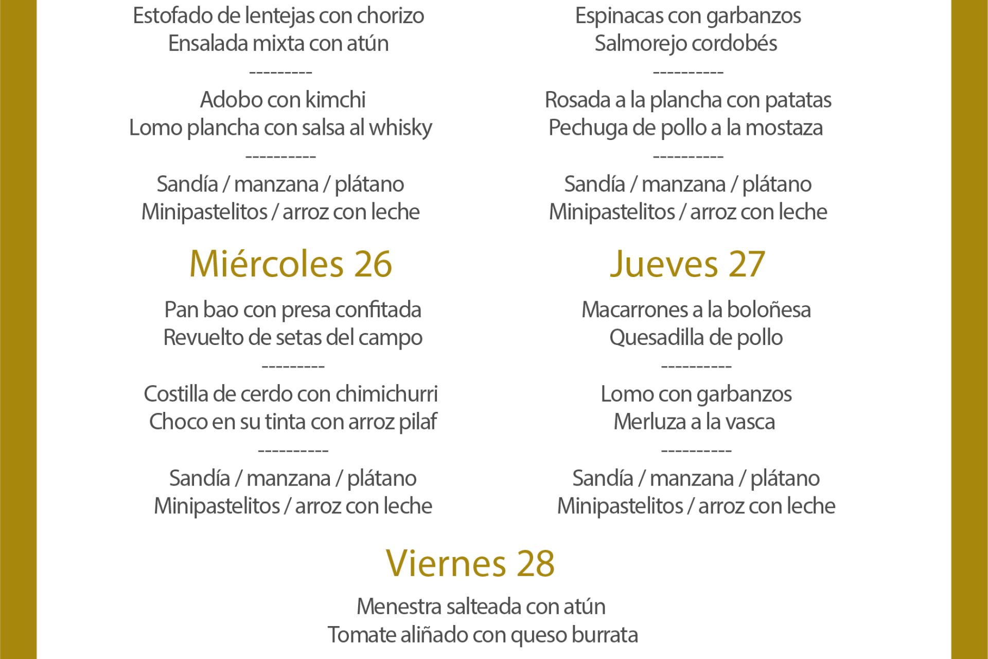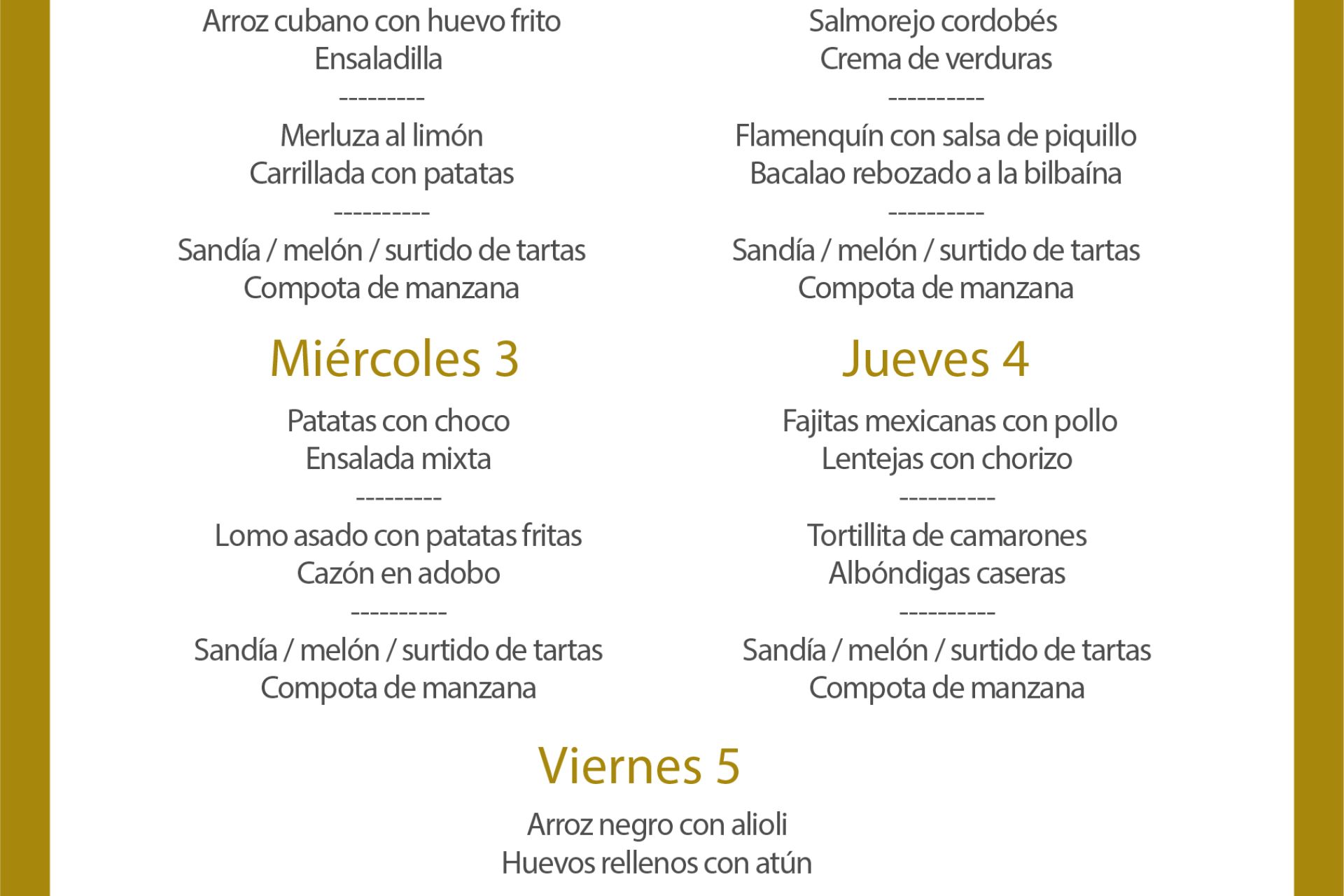 Menú intersemanal del servicio de restauración del Club Náutico