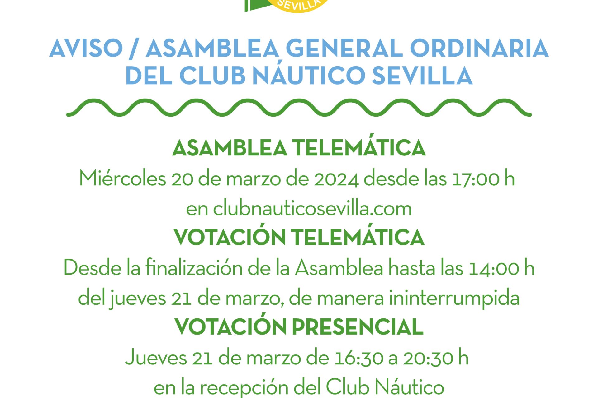 Los socios de Honor, Fundadores y Numerarios del Club Náutico Sevilla están citados de forma presencial y telemática este miércoles, 20 de marzo de 2024, a las 17:00 horas en primera convocatoria o a las 17:15 horas en segunda convocatoria.