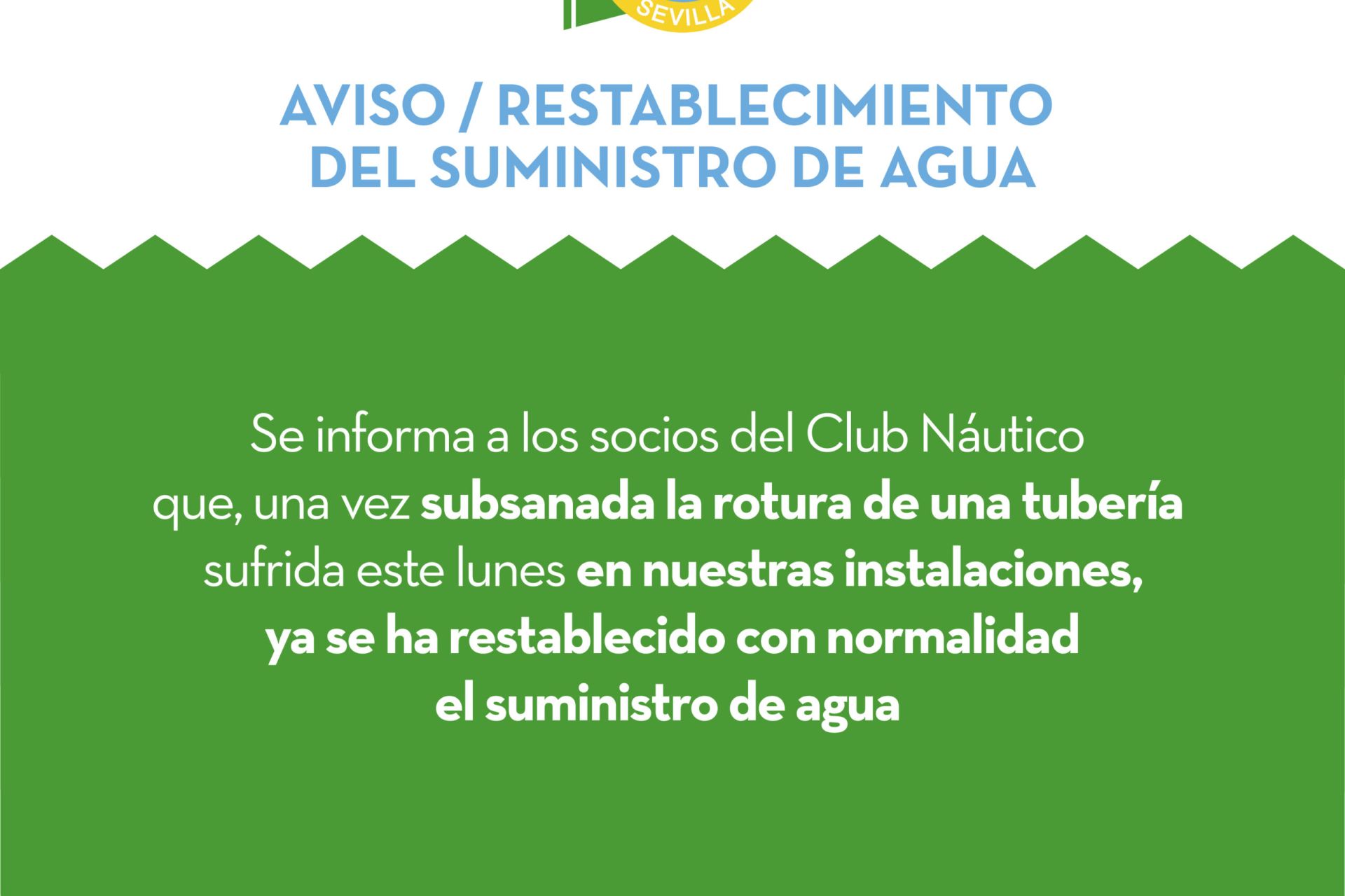 Se informa a los socios del Club Náutico que, una vez subsanada la rotura de una tubería sufrida este lunes en nuestras instalaciones, ya se ha restablecido con normalidad el suministro de agua.