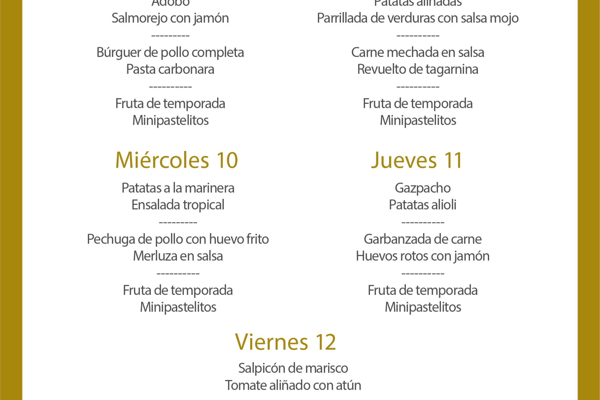 Menú disponible a mediodía desde el lunes 8 al viernes 12 de abril en la planta alta del salón social al precio de 9€/persona (IVA, pan/picos y una bebida incluidos).