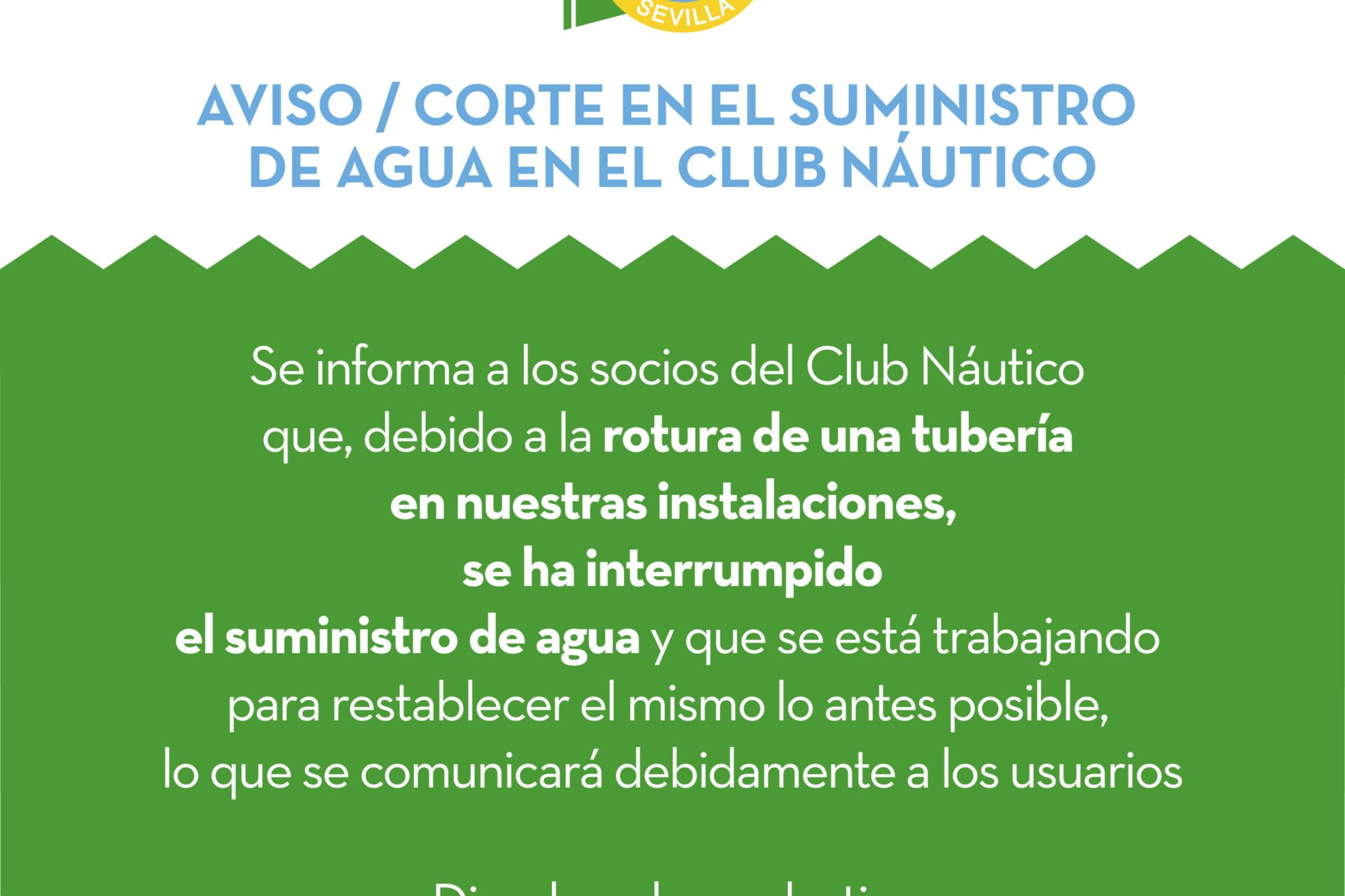 Se informa a los socios del Club Náutico que, debido a la rotura de una tubería en nuestras instalaciones, se ha interrumpido