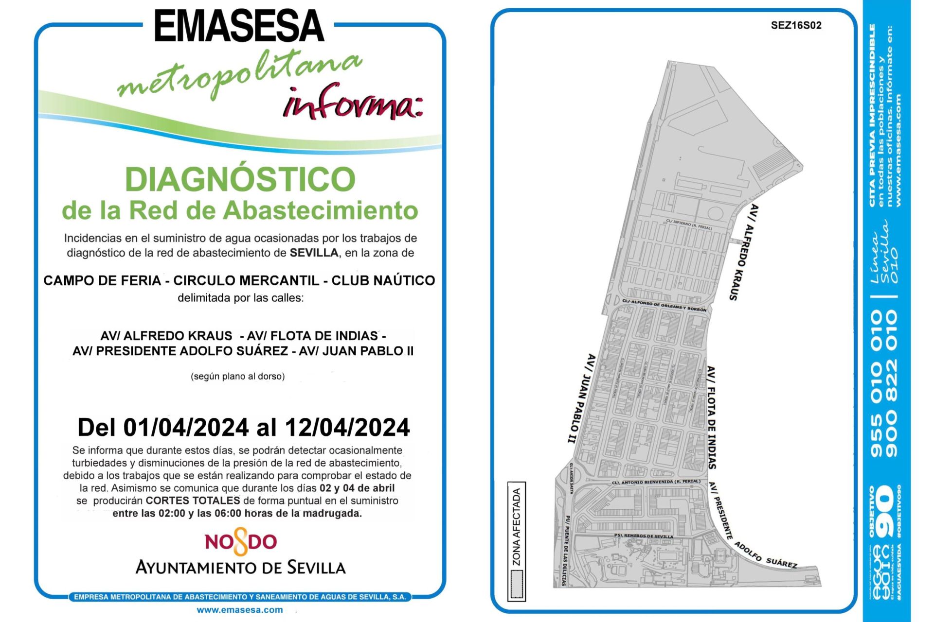 Debido a labores de mantenimiento de EMASESA, del 1 al 12 de abril se podrán detectar ocasionalmente turbiedades y disminución de la presión de la red de abastecimiento.