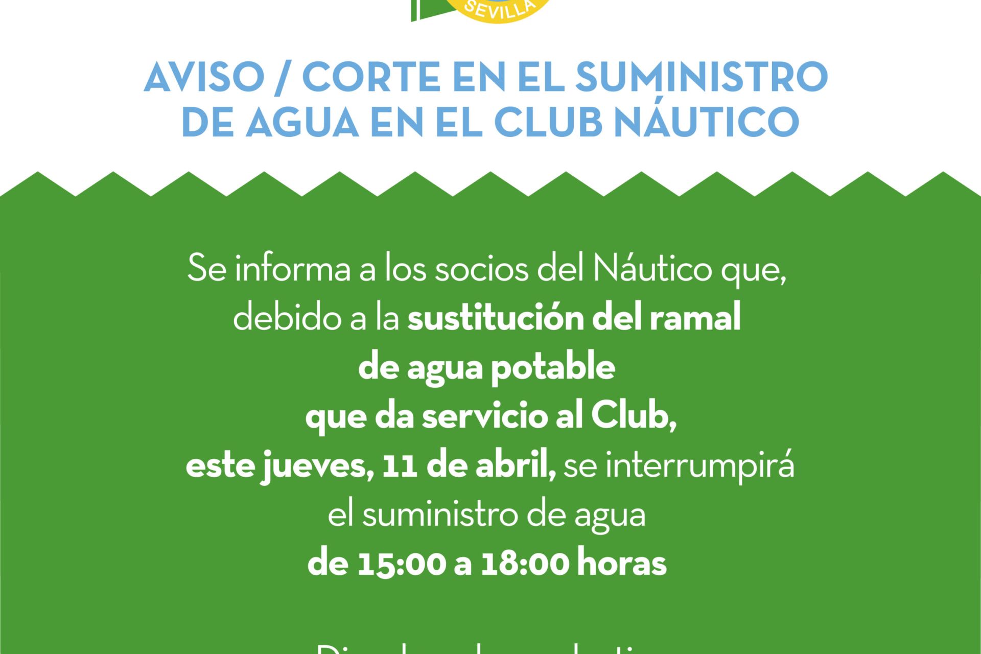 Se informa a los socios del Club Náutico que, debido a la sustitución del ramal de agua potable que da servicio al Club, este jueves, 11 de abril, se interrumpirá el suministro de agua este jueves de 15:00 a 18:00 horas.