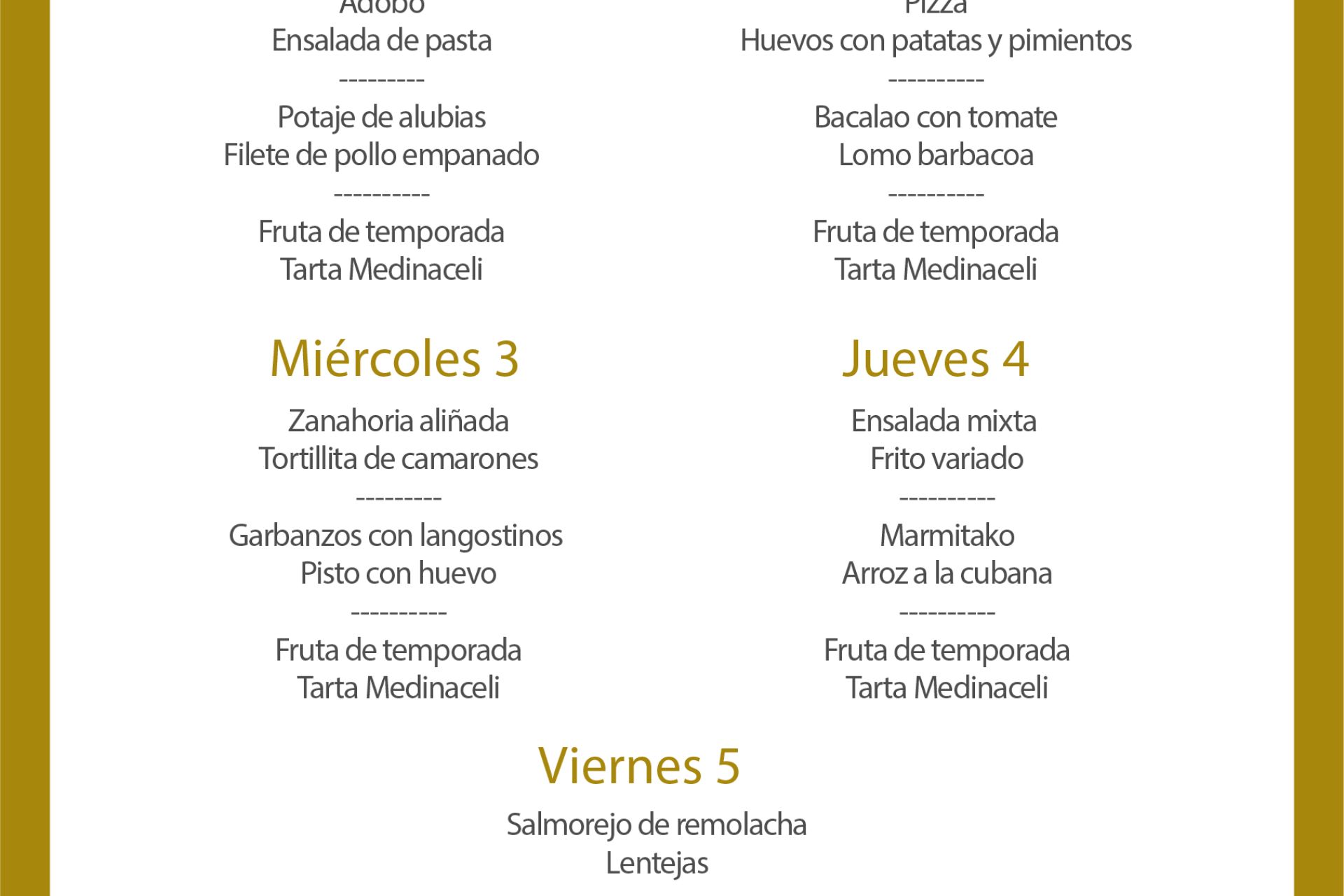 Menú intersemanal del servicio de restauración del Club Náutico