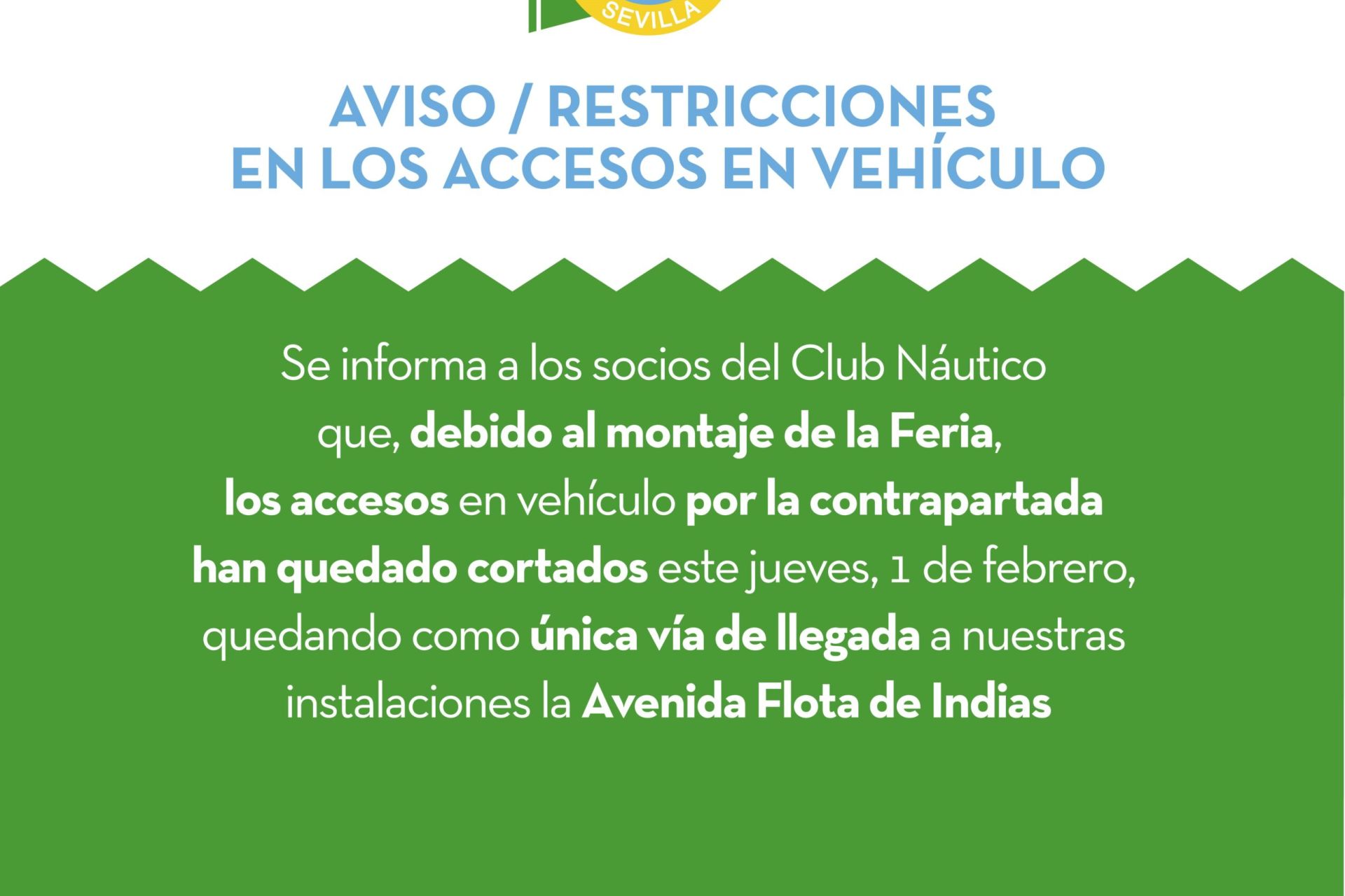 Se informa a los socios del Club Náutico que, debido al montaje de la Feria, los accesos en vehículo por la contrapartada han quedado cortados este jueves, 1 de febrero, quedando como única vía de llegada a nuestras instalaciones la Avenida Flota de Indias.