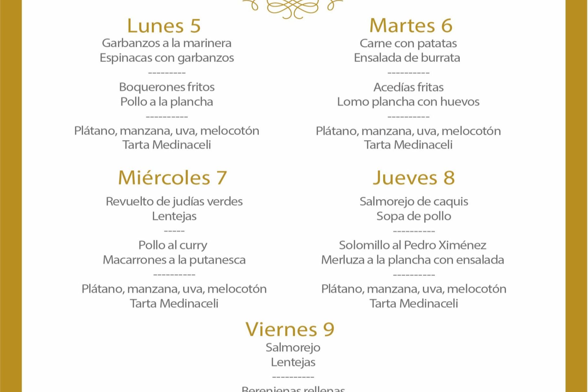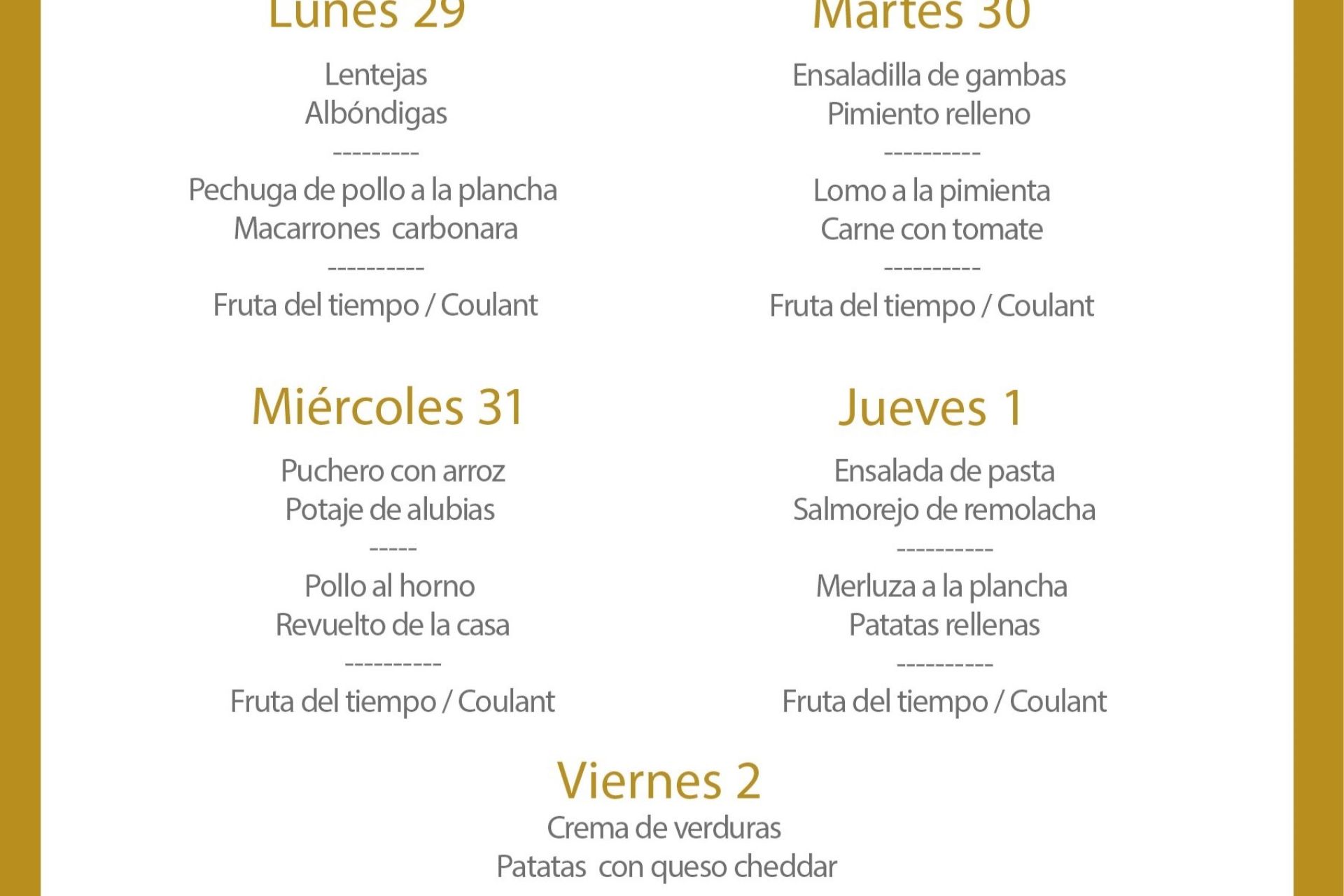 Menú intersemanal del servicio de restauración del Club Náutico