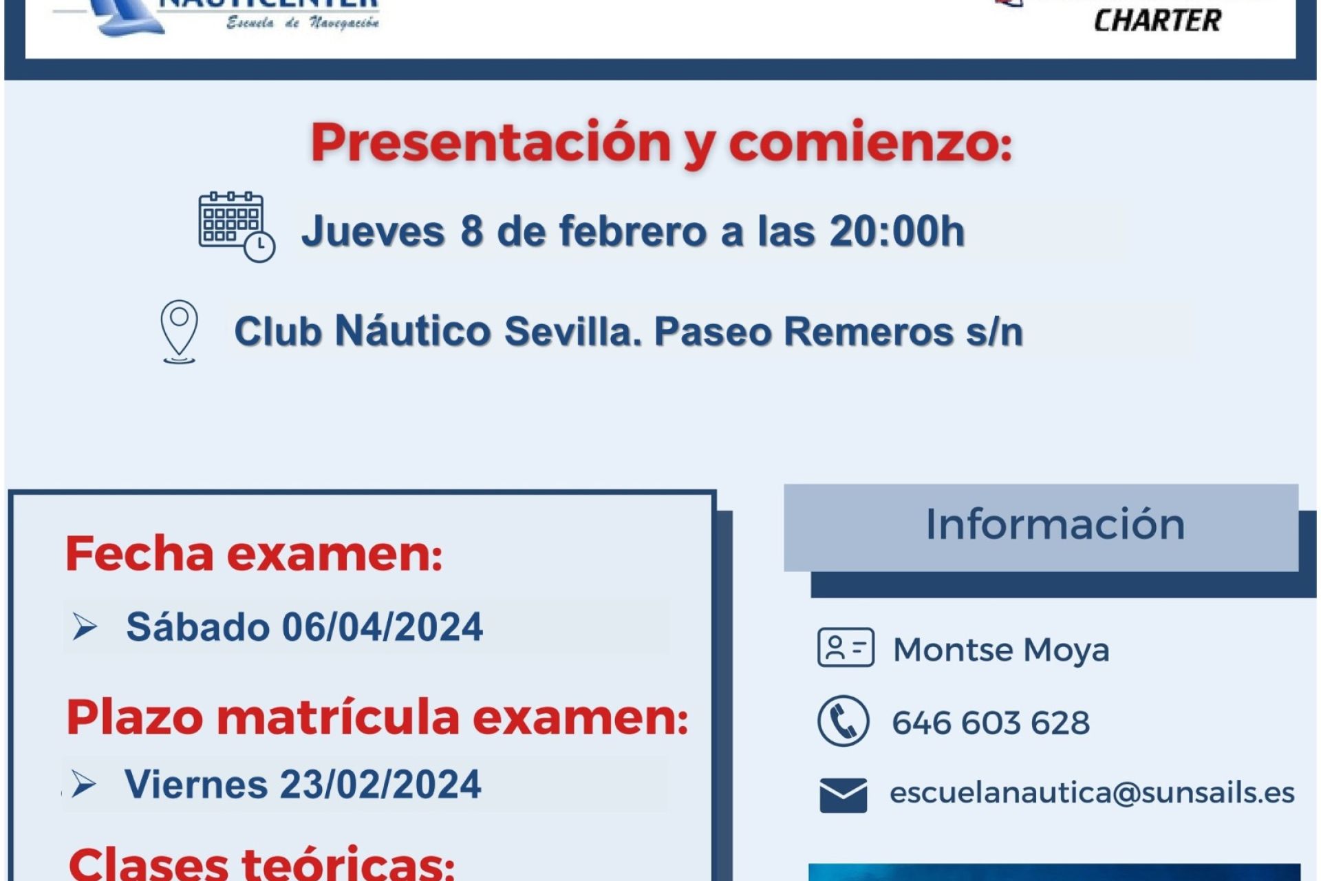 Cursos de Patrón de Embarcaciones de Recreo (PER), Patrón de Navegación Básica (PNB) y PER Reducido. Presentación y comienzo, jueves 8 de febrero a las 20:00 h en el Club Náutico Sevilla. Fecha de examen, 6 de abril. Matrícula, hasta el 23 de febrero. Clases teóricas, martes y jueves de 20:00 a 22:00 h. Bonificación del 10% para los socios del Club Náutico Sevilla.