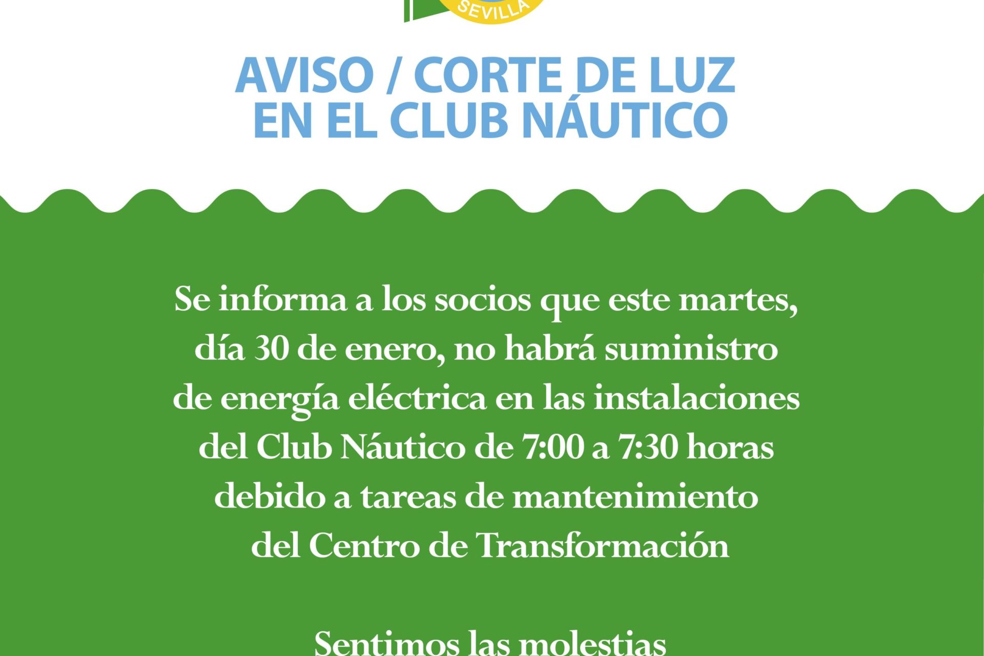 Se informa a los socios que este martes, día 30 de enero, no habrá suministro de energía eléctrica en las instalaciones del Club Náutico de 7:00 a 7:30 horas debido a tareas de mantenimiento del Centro de Transformación.