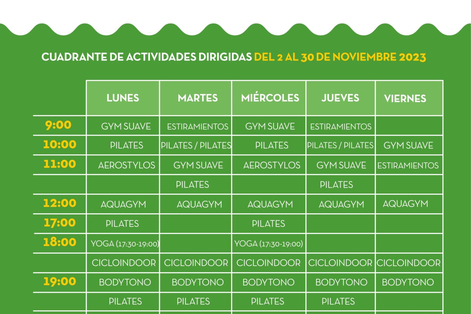 De lunes a viernes, de 9:00 a 22:00 horas, clases de Pilates, estiramientos, aerostylos, gym suave, aquagym, yoga, cicloindoor, bodytono, GAP 30" y crosstraining.