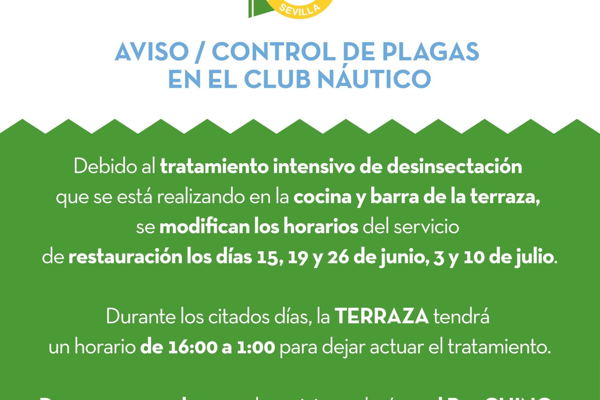 Se recuerda a los socios que debido al tratamiento intensivo de desinsectación que se está realizando en la cocina y barra de la terraza, se modifican los horarios del servicio de restauración los días 15, 19 y 26 de junio, 3 y 10 de julio.