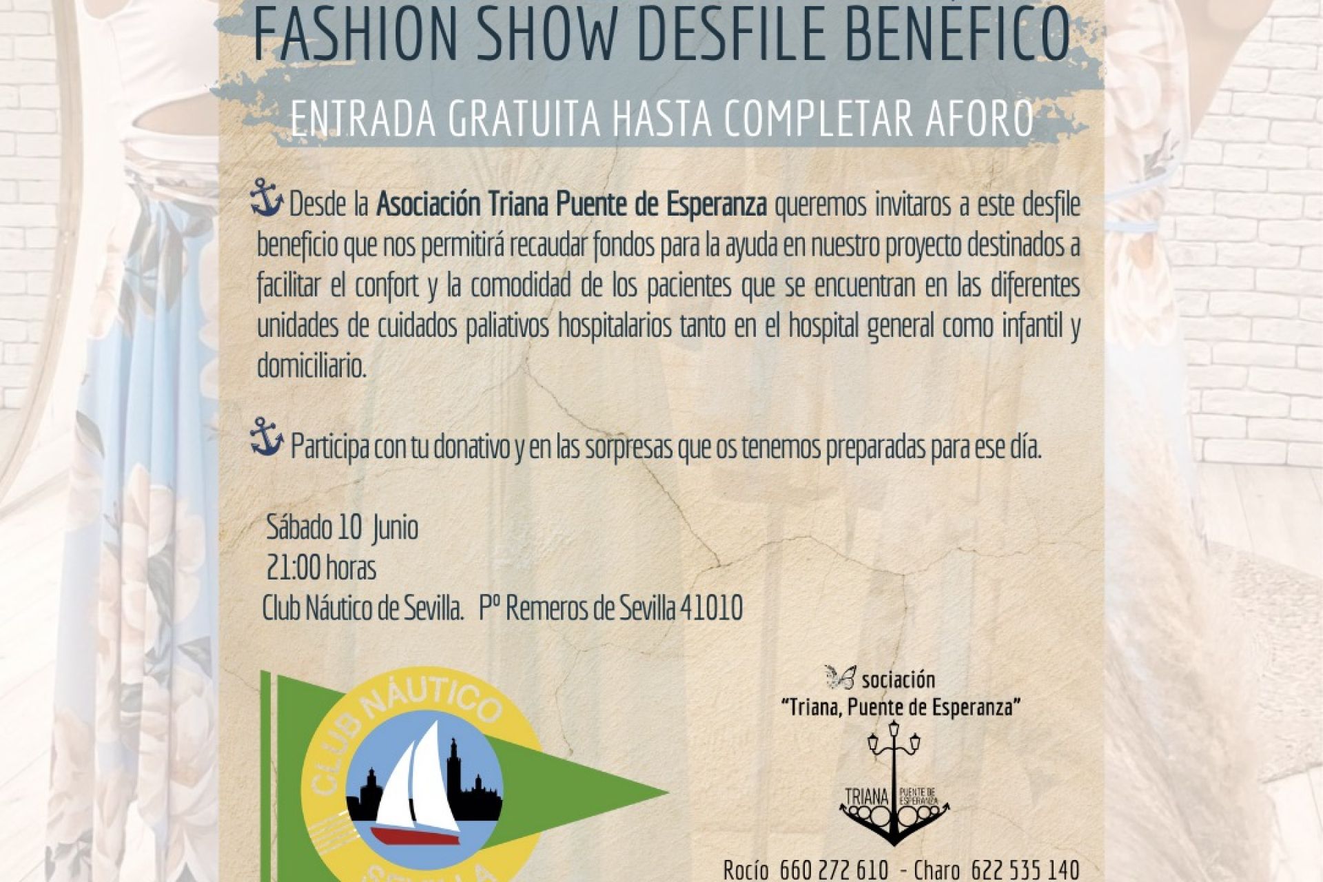 Este sábado a las 21:00 h en el salón social del Club Náutico a beneficio de la 'Asociación Triana, puente de esperanza', con el fin de recaudar fondos para pacientes de unidades de cuidados paliativos hospitalarios. Entrada gratuita hasta completar aforo. Participa con tu donativo y disfruta del fashion show y con las sorpresas preparadas durante el desfile.