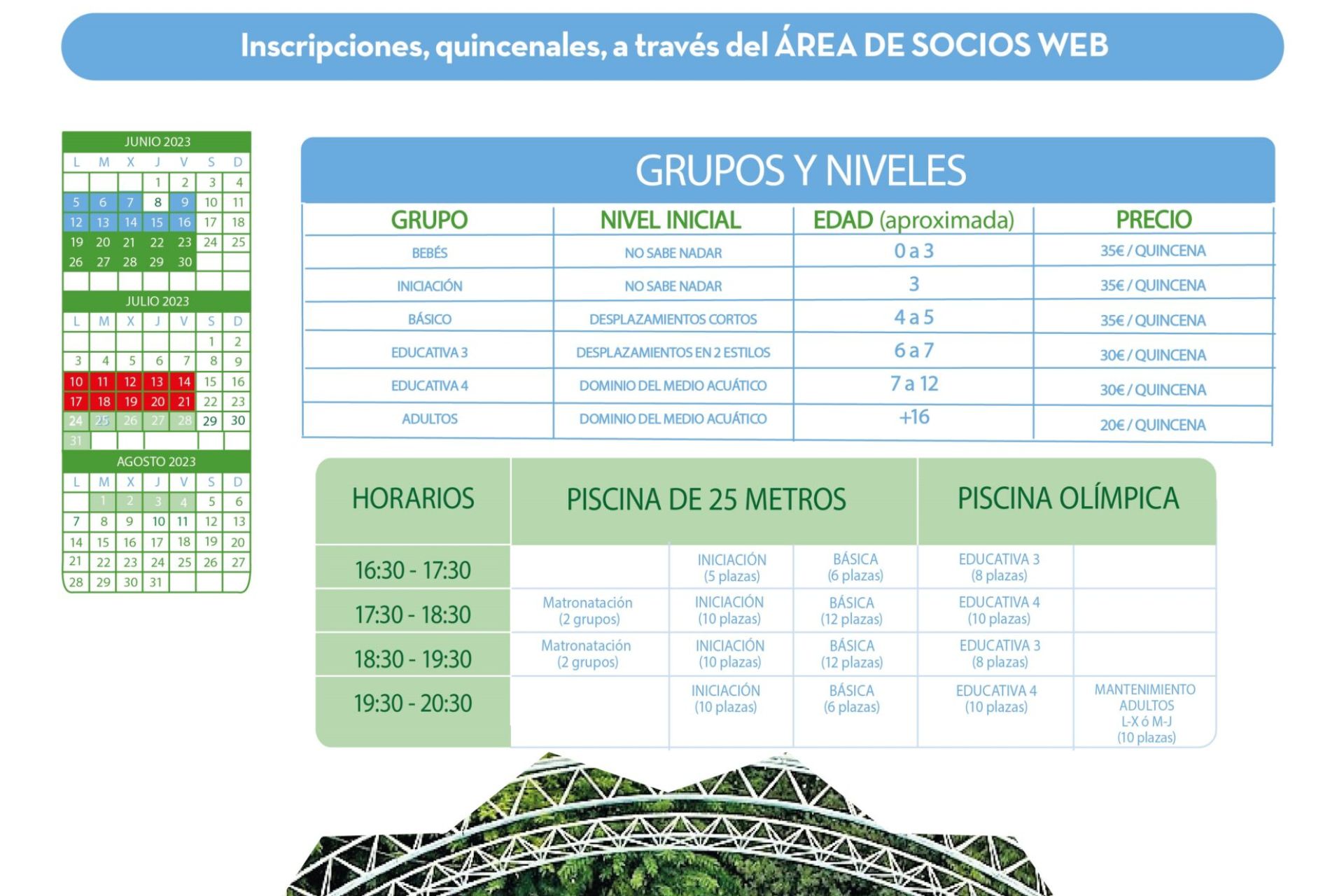 Abierto el plazo de inscripción, a partir del miércoles 31 de mayo a las 12:00 h, para la primera quincena de cursillos de verano, programados del 5 de junio al 4 de agosto para todas las edades y niveles. Inscripciones, a través del ÁREA DE SOCIOS WEB, habilitándose lista de espera en el caso de que se agoten las plazas para cubrir posibles vacantes.