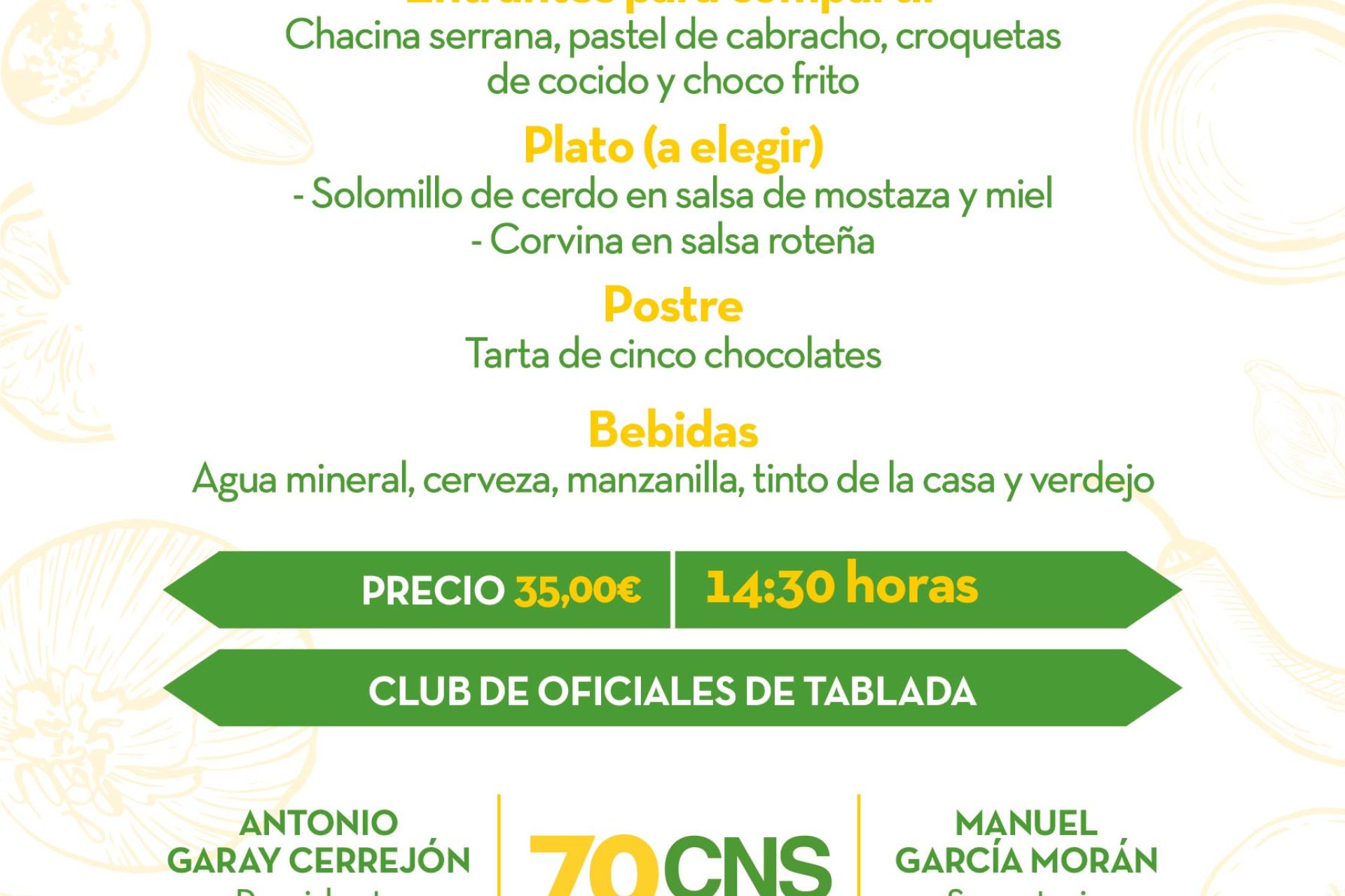 Convocatoria prenavideña para los jubilados del Náutico, a celebrar en el Club de Oficiales de Tablada el 22 de diciembre a las 14:30 h. Precio, 35€. Se ruega confirmación y elección de plato en Conserjería o el 954 45 47 77 antes del 15 de diciembre a las 20:00 h. Los asistentes deben facilitar nombre, apellidos, DNI y matrícula del vehículo en el caso de que asistan con el mismo.