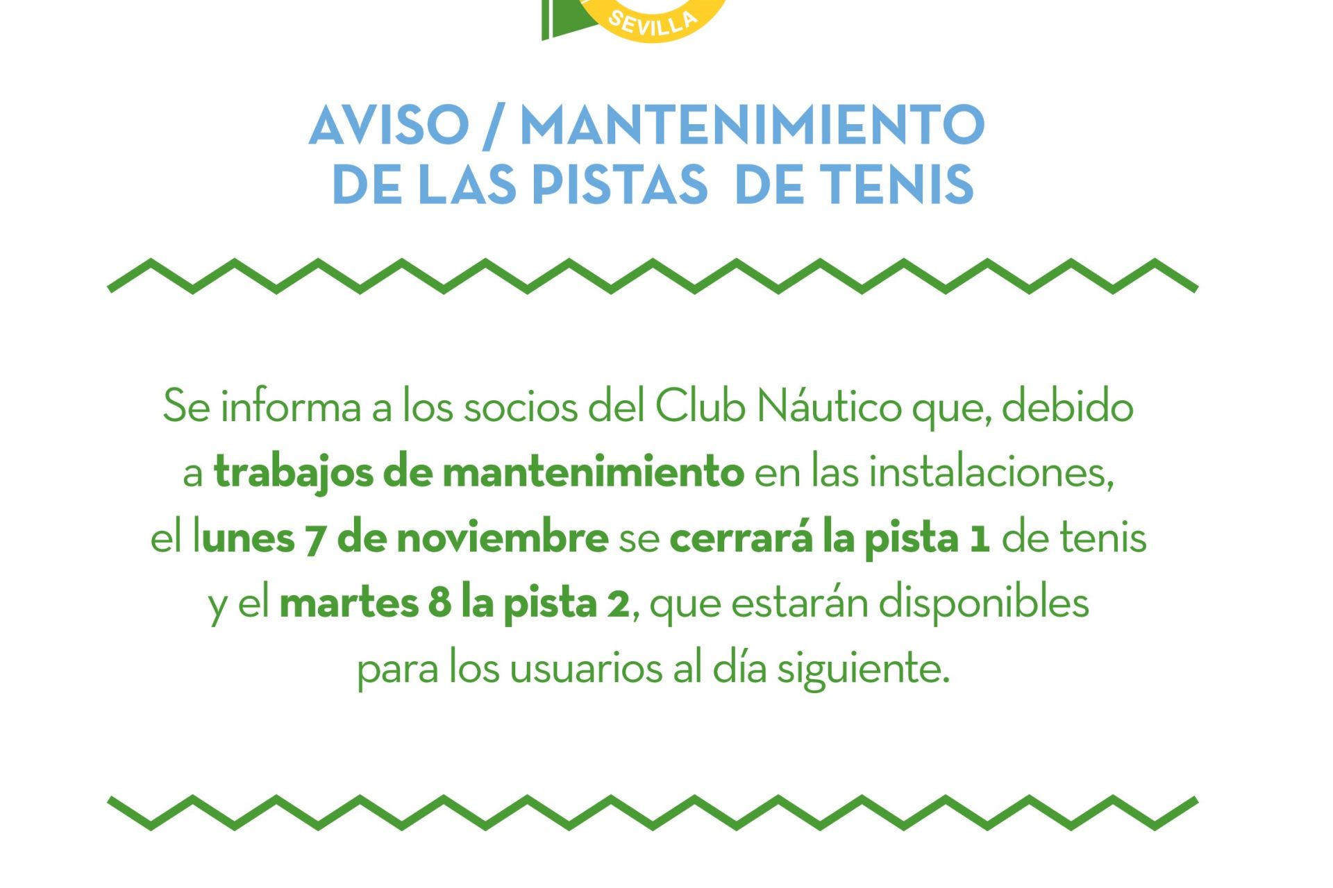 Se informa a los socios del Club Náutico que, debido a trabajos de mantenimiento en las instalaciones, el lunes 7 de noviembre se cerrará la pista 1 de tenis y el martes 8 la pista 2, que estarán disponibles para los usuarios al día siguiente.