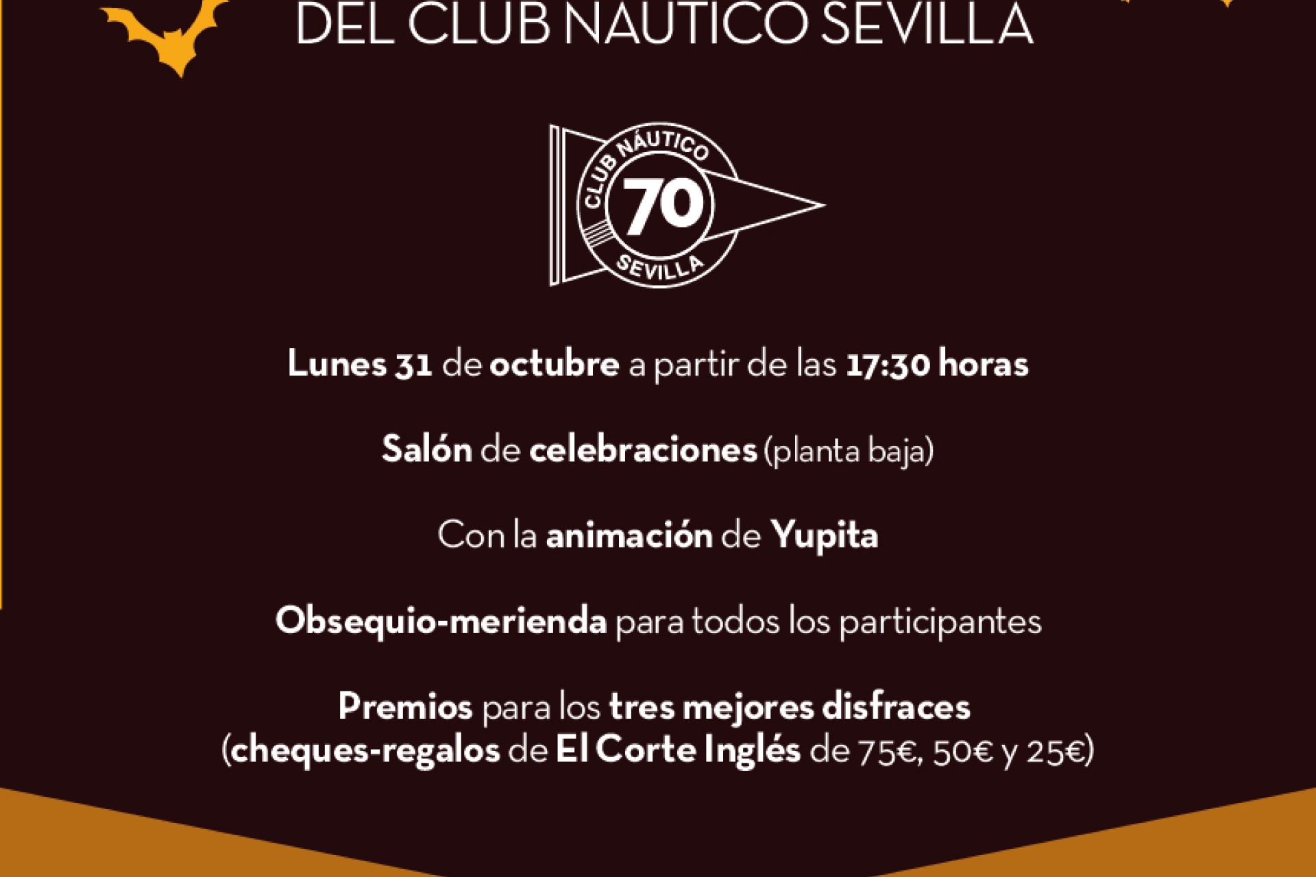 Este lunes 31 de octubre, ven y disfruta de una fiesta terrorífica a partir de las 17:30 h en la planta baja del salón de celebraciones con la animación de Yupita. Obsequio-merienda para todos los participantes y premios para los tres mejores disfraces (cheques-regalo de El Corte Inglés de 75€, 50€ y 25€). SomosNáutico