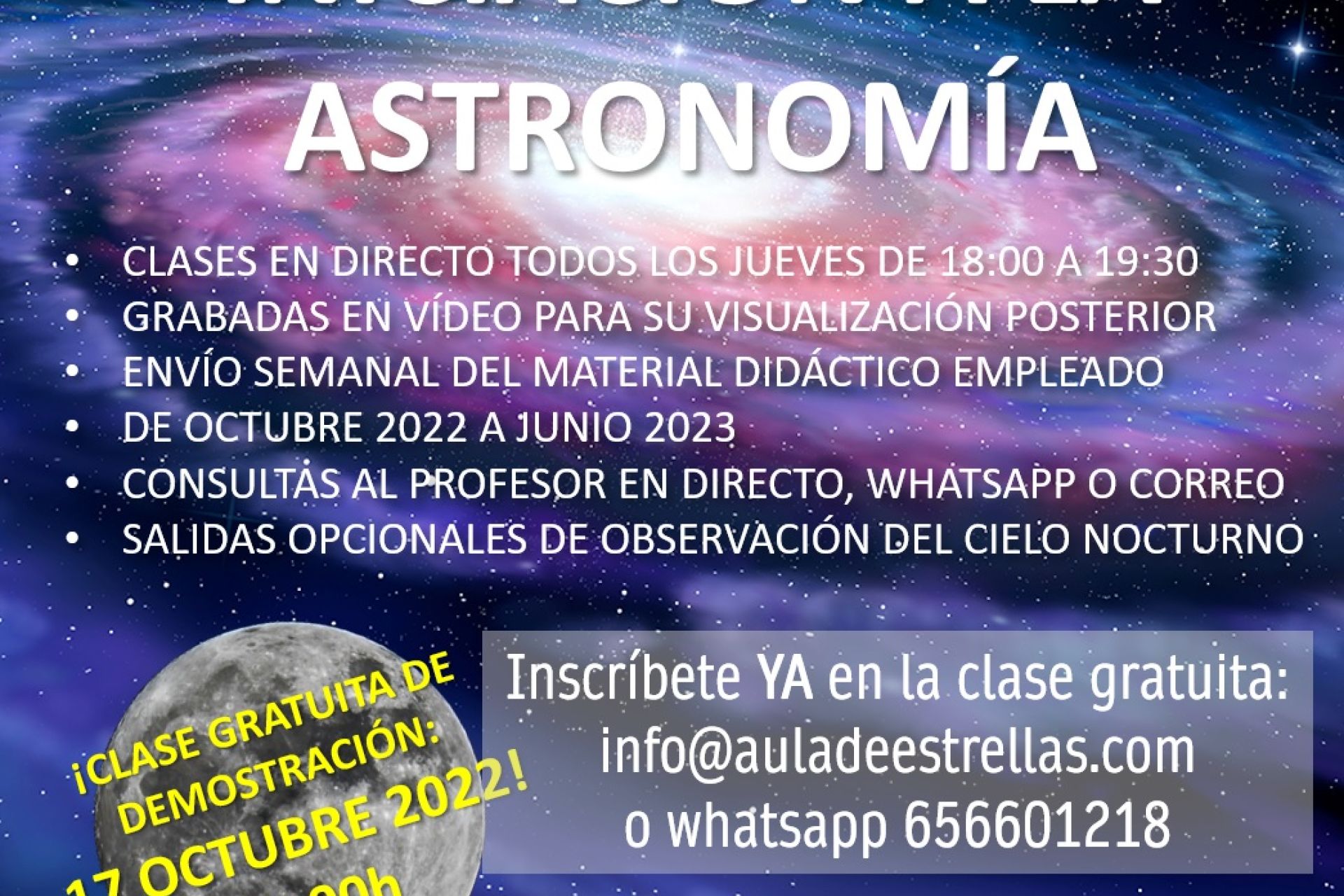Organizado por Aula de Estrellas desde el 20 de octubre hasta el 29 de junio. Este lunes, día 17, demostración gratuita de 18:00 a 19:30 h. Inscripciones, por email (info@auladeestrellas.com) o WhatsApp (656 601 218).
