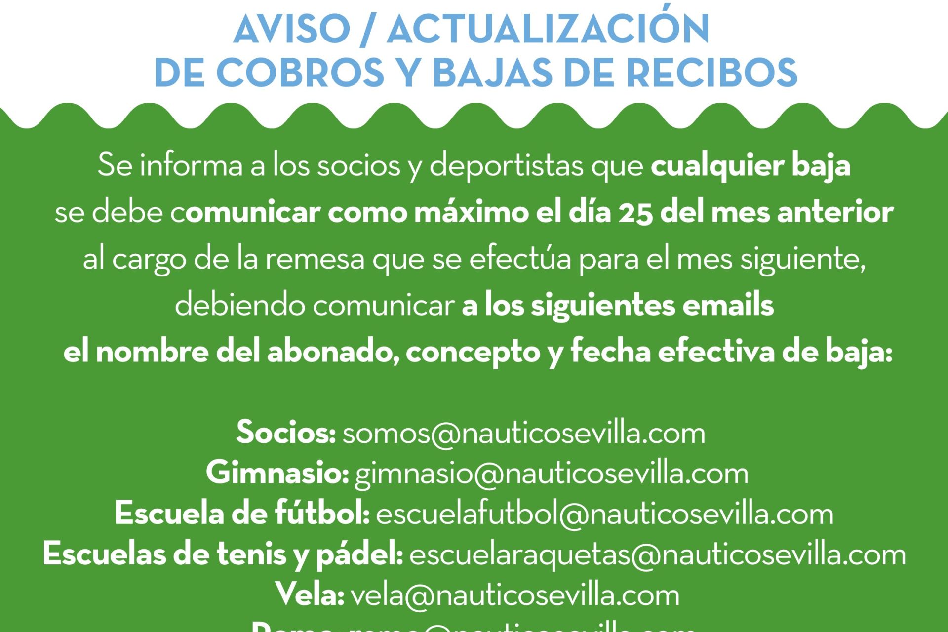 Se informa a los socios y deportistas que cualquier baja se debe comunicar como máximo el día 25 del mes anterior al cargo de la remesas que se efectúa para el mes siguiente, debiendo comunicar por email el nombre del abonado, concepto y fecha efectiva de baja.