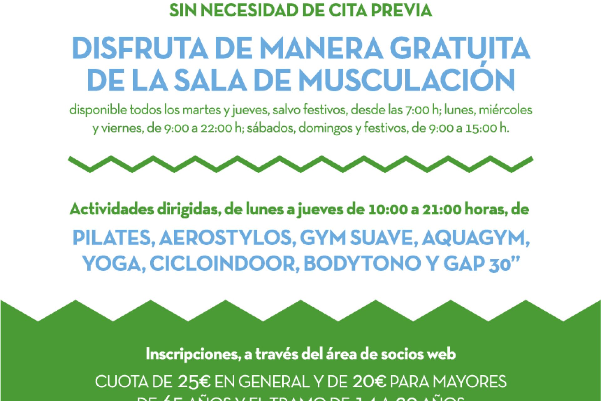Disfruta de manera gratuita de la sala de musculación, sin necesidad de reserva previa, todos los martes y jueves, salvo festivos, desde las 7:00 h; lunes, miércoles y viernes, de 9:00 a 22:00 h; sábados, domingos y festivos, de 9:00 a 15:00 h.