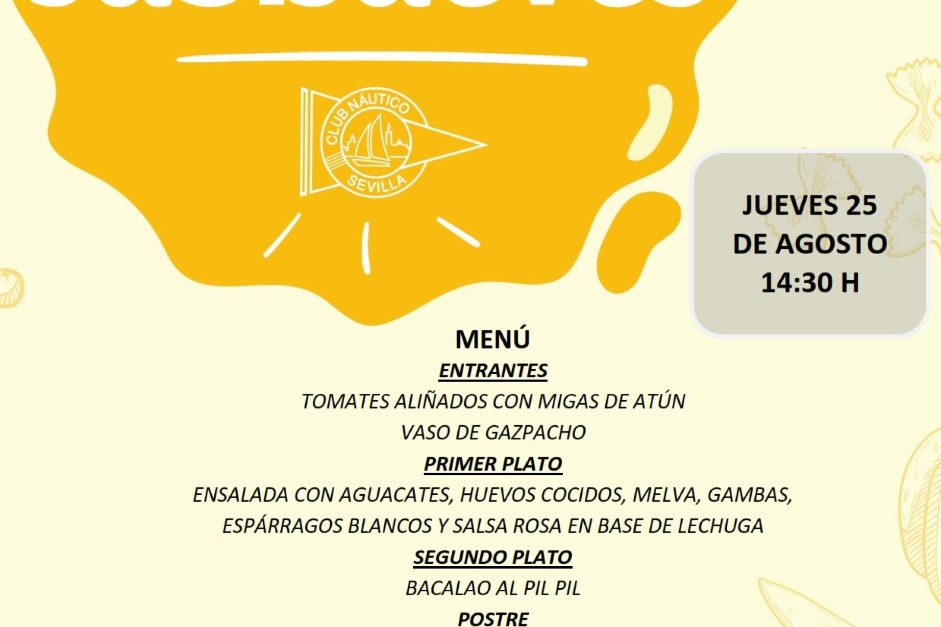 La nueva convocatoria de la temporada estival para los jubilados del Club Náutico se celebrará el jueves 25 de agosto a las 14:30 horas. Se ruega confirmación previa con antelación en Conserjería o el 954 454 777.