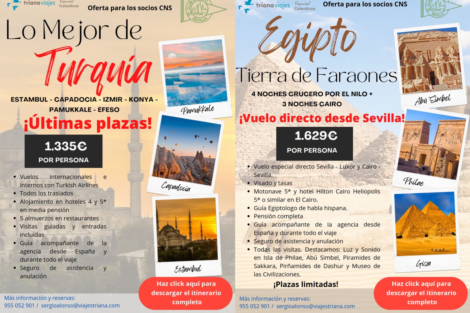 Pueden beneficiarse de descuentos en estancias, paquetes turísticos, cruceros (5%) y lunas de miel (7%). Más información, en 955 052 901, colectivos@viajestriana.com y trianaviajescolectivos.com