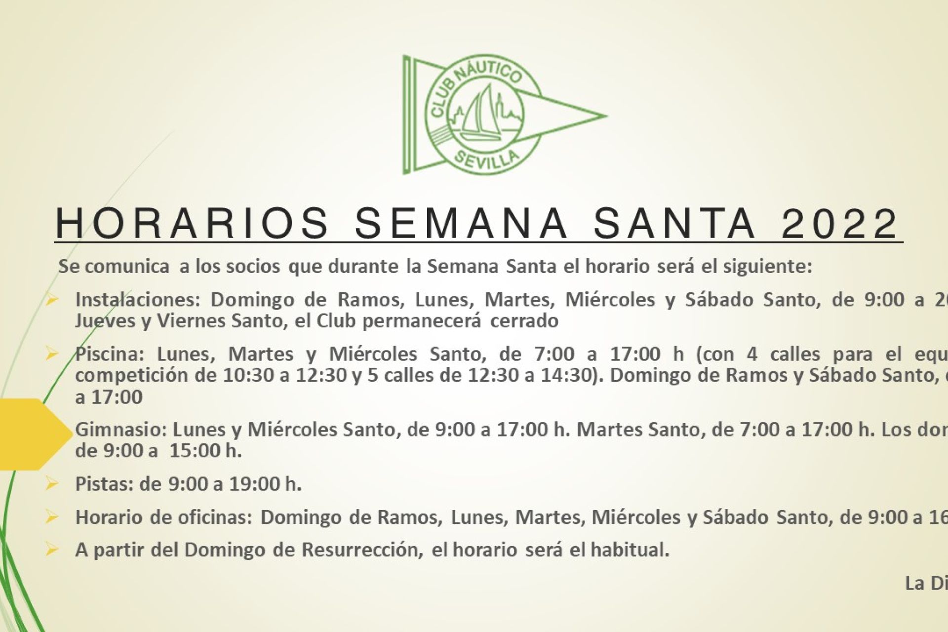 Horarios especiales de las instalaciones y los distintos servicios del Club Náutico desde el Domingo de Ramos, 10 de abril, hasta el Domingo de Resurrección, día 17.